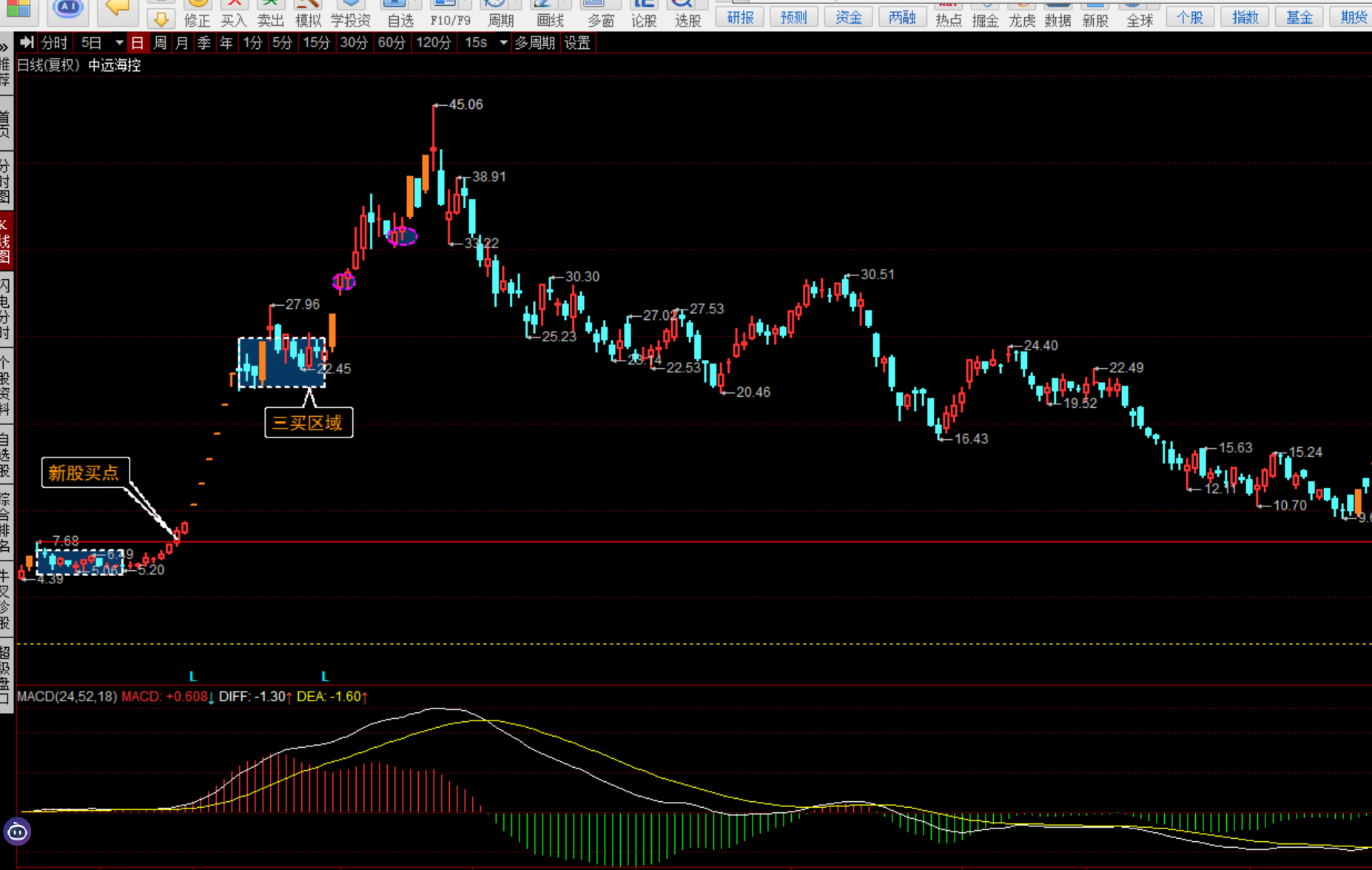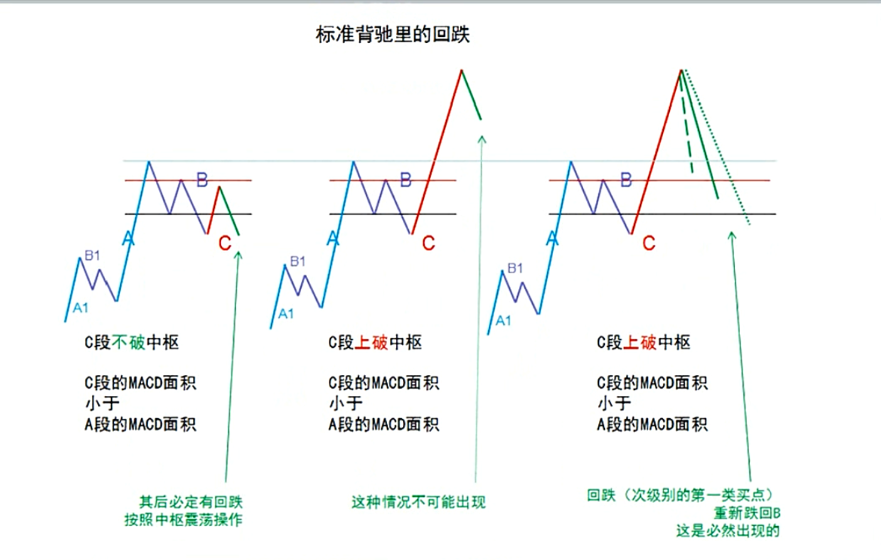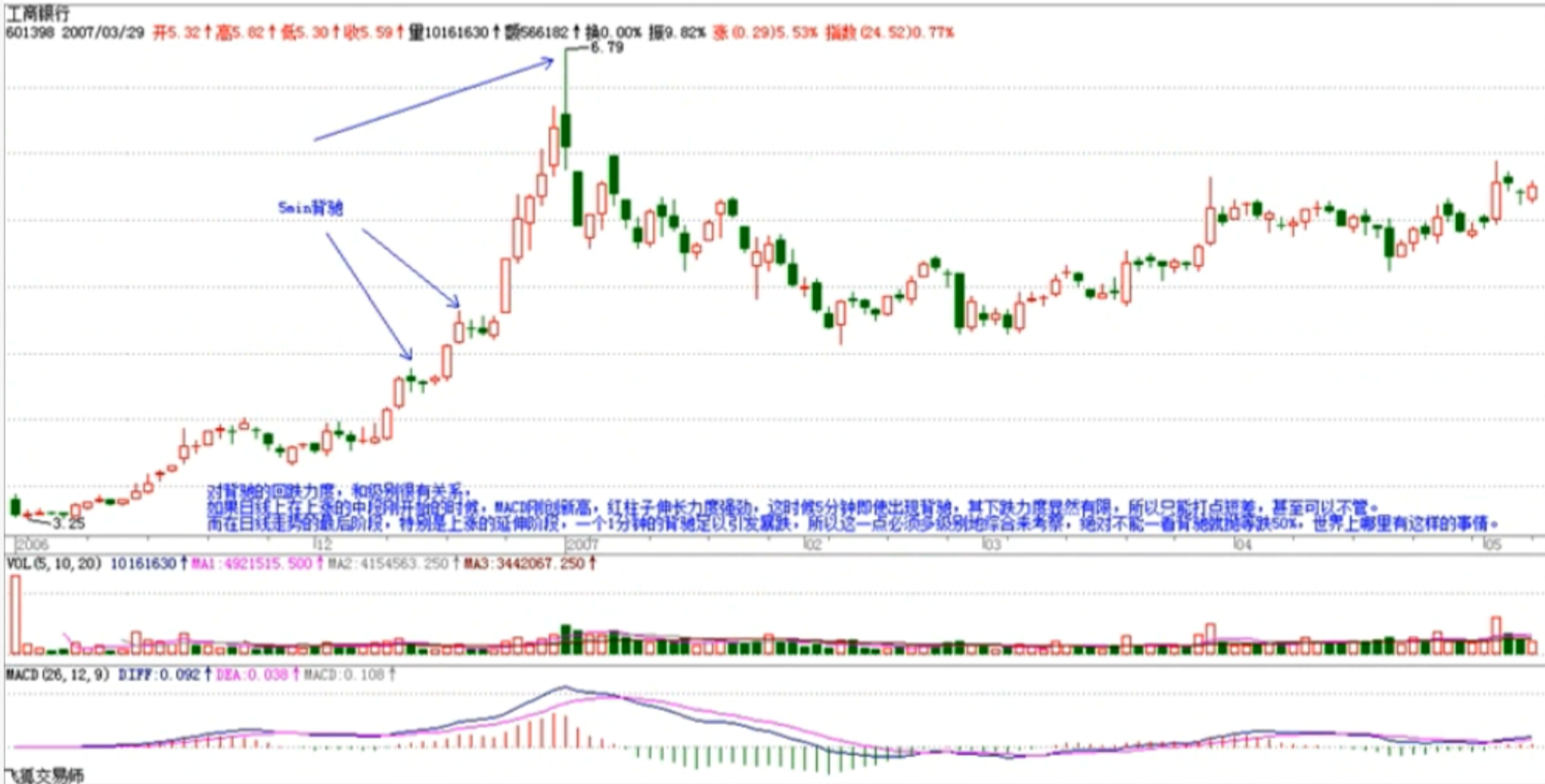 一般来说:一个标准的两中枢上涨,在MACD上会表现出这样的形态,第一段MACD从0轴下方上穿上来,在0轴上方停留的同时,形成第二类买点(次级别),同时形成相应的第一个中枢(本级别),其后突破该中枢,MACD黄白线也快速拉起,这往往是主升浪,一切走势的延伸和MACD指标绕来绕去钝化,这一段(次级别)等其背驰结束(应用区间套次次级别判断),然后进入第二个中枢的形成过程(背驰转折定理,至于三种情况的哪种看涨幅,位置决定性质,幅度过高3浪就结束了),同时黄白线会第二次回抽0轴,最后开始突破第二个中枢,MACD黄白线再次拉起红柱面积也放大,但是总体幅度要小于上一次。所以形成趋势背驰。大多数情况该段走势结束。