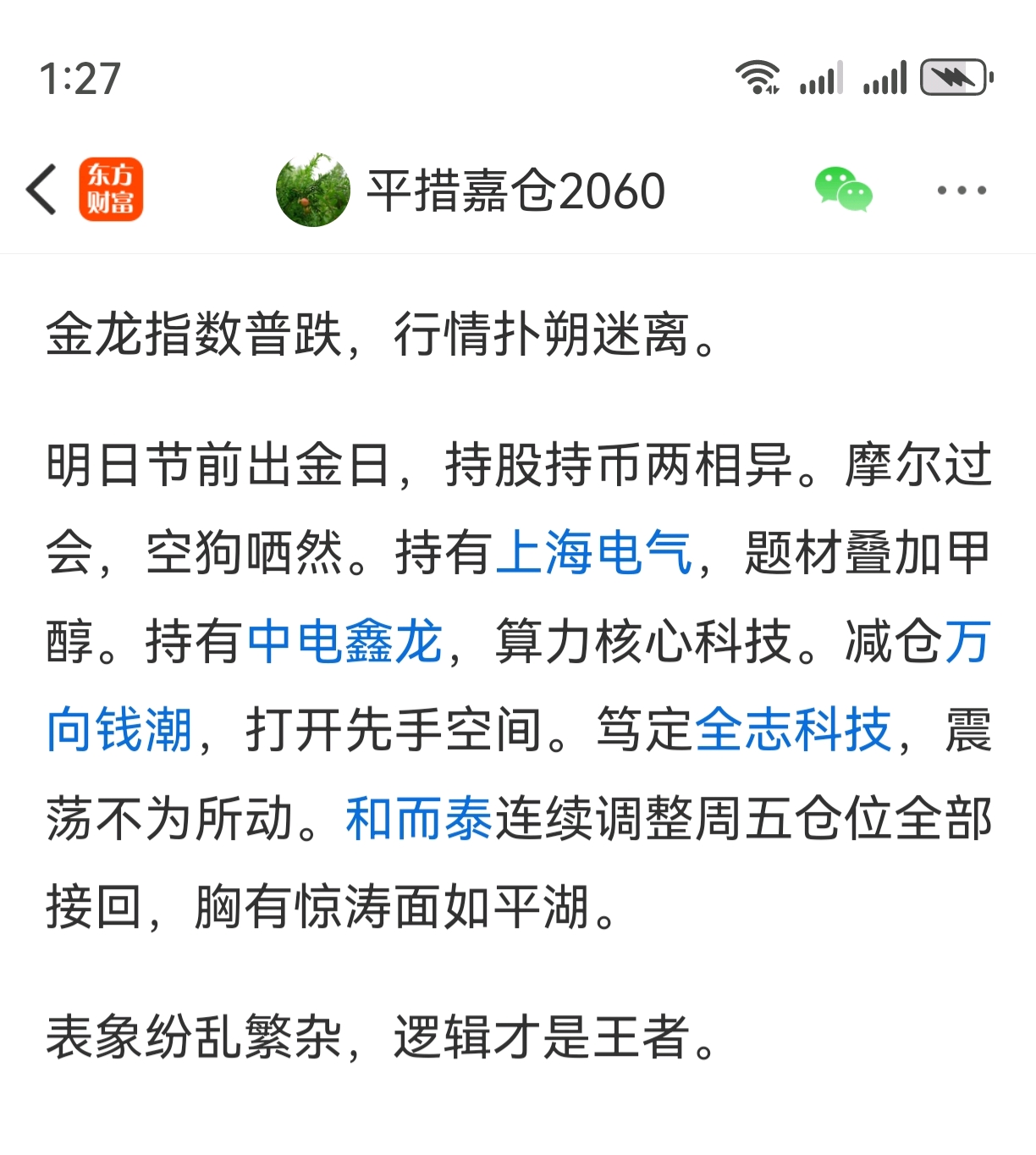 今天是最后出金日,总体仓位宜略减。节前按惯例缩量,可取舍。盘中减仓上海电气,底仓观望。开盘抛出中电鑫龙,落袋止盈。万向钱潮二浪开启,持仓待涨。摩尔三剑客初灵大众和而泰。一则十倍,一则龙头,一则中军。小幅加仓。