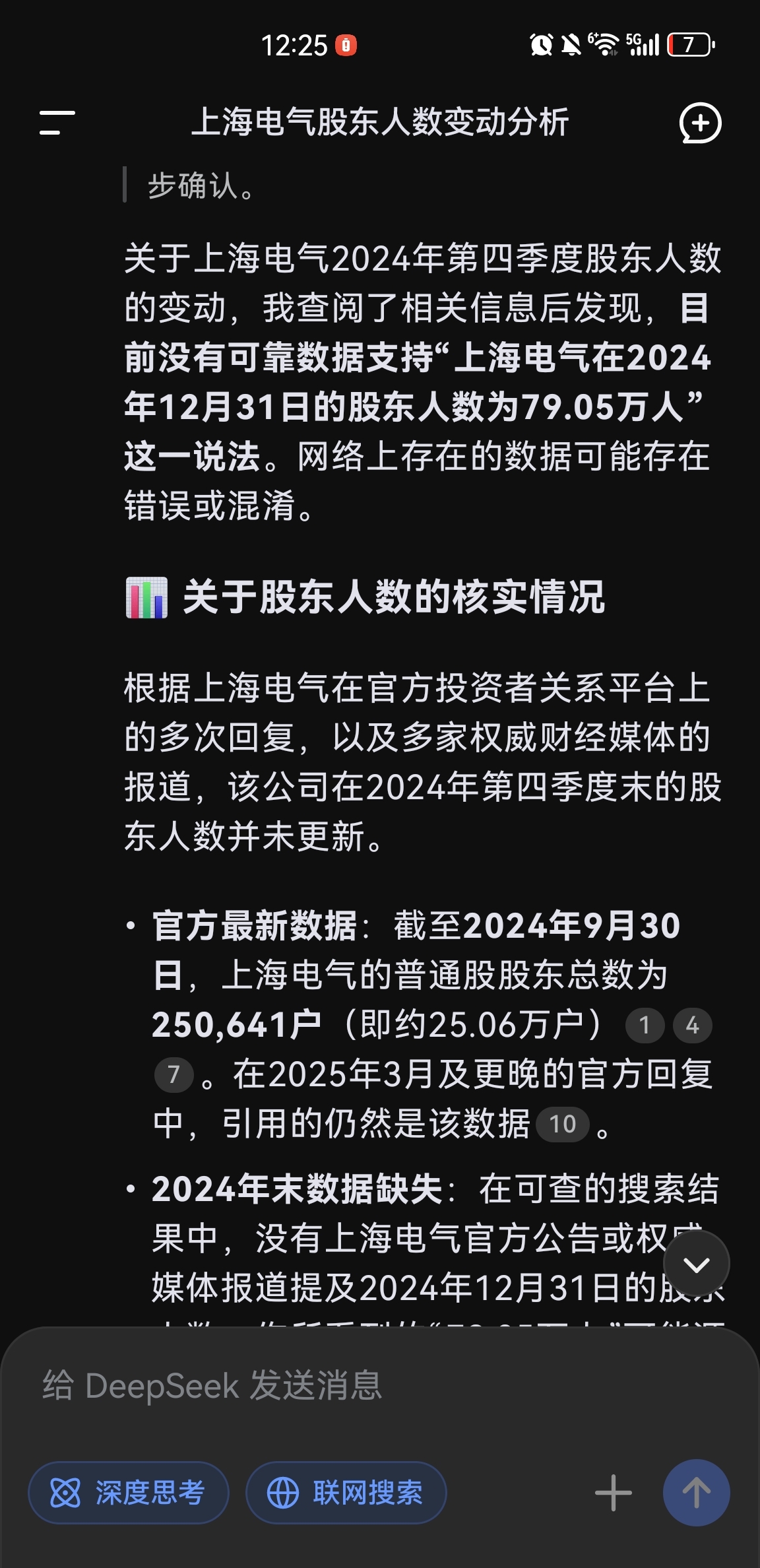 $上海电气(SH601727)$ 上海电气2024年9月30日股东人数为25.06万人,但是到2024年12月31日变为79.05万人,为什么短短几个月会有数量级的增长?deepseek不认可79万人,现在股东到底多少人?