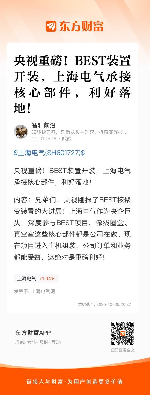 内容:兄弟们,央视刚报了BEST核聚变装置的大进展!上海电气作为央企巨头,深度参与BEST项目,像线圈盒、真空室这些核心部件都是公司在做。现在项目进入主机组装,公司订单和业务都能受益,这绝对是重磅利好!