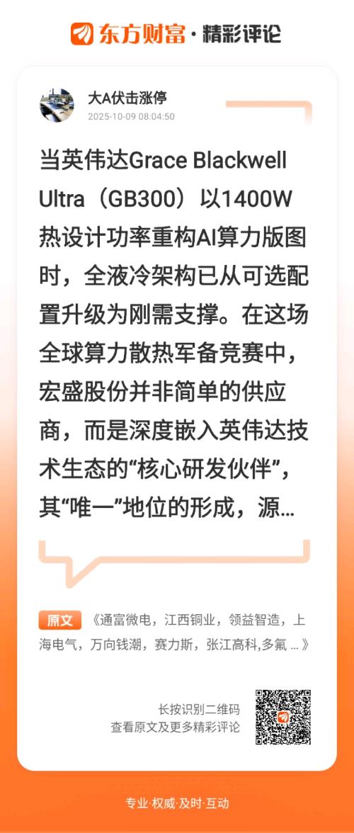 //@大A伏击涨停 :当英伟达Grace Blackwell Ultra(GB300)以1400W热设计功率重构AI算力版图时,全液冷架构已从可选配置升级为刚需支撑。在这场全球算力散热军备竞赛中,宏盛股份并非简单的供应商,而是深度嵌入英伟达技术生态的“核心研发伙伴”,其“唯一”地位的形成,源于技术积淀、供应链绑定与未来需求的三重锁定。 $上海电气(SH601727)$$张江高科(SH600895)$$中芯国际(SH688981)$