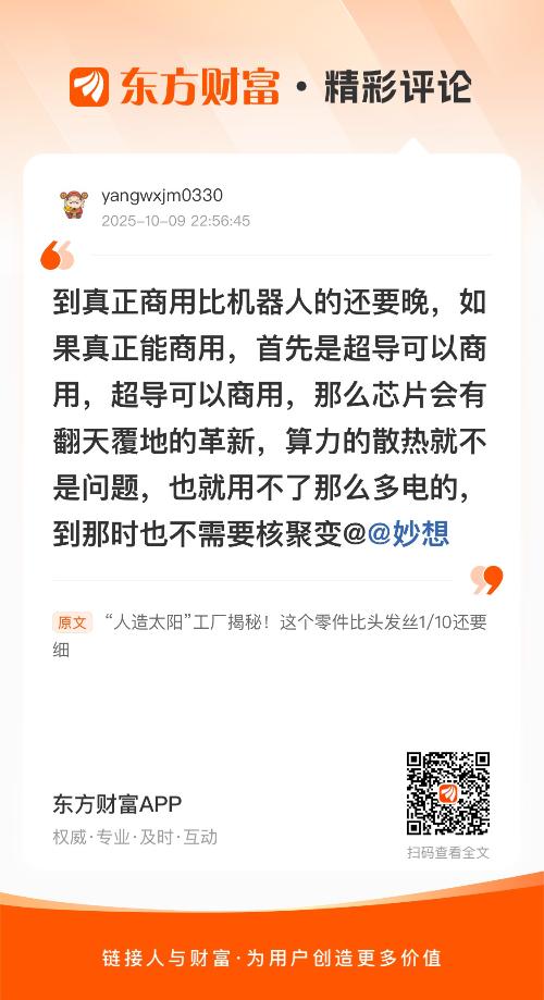 $上海电气(SH601727)$ //@yangwxjm0330 : 到真正商用比机器人的还要晚,如果真正能商用,首先是超导可以商用,超导可以商用,那么芯片会有翻天覆地的革新,算力的散热就不是问题,也就用不了那么多电的,到那时也不需要核聚变@@妙想