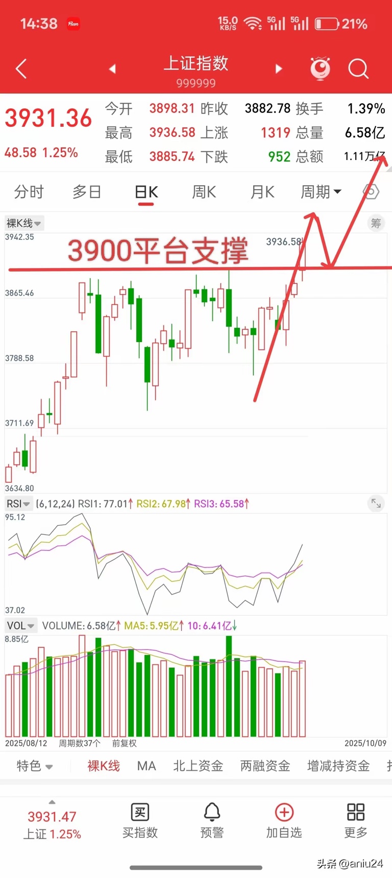A股,或新一波牛市行情已经开启。一个平台一旦突破,它大概率会加速,为什么?因为有大资金进场,那这里就是大资金的成本所在,如果主力资金手里的筹码够多,后面会连续拉升,不会回踩,反之如果主力资金手里的筹码不够,它会开启洗盘,但洗盘不会跌破主力成本。这就是我节前,节中,节后一直提示的,突破后的二次回踩,是我们散户最有效的方法之一,不论指数,不论板块,不论个股。9.27号在微 公分享的中油,航科,自分享之后二次回踩前顶,累计涨幅8%,和7%,9.10号在微 公分享的能科,自分享之后,回踩前顶,累计涨幅22%。(以上案例仅供参考学习,不做投资买卖建议)突破后的二次回踩,回踩位置很讲究,那就是前高平台附近,我们要做的就是提前在这里埋伏,错了,小止损离场,对了,吃大肉,用最小的止损,去博弈最大的利润,且胜率高,盈亏比划算。