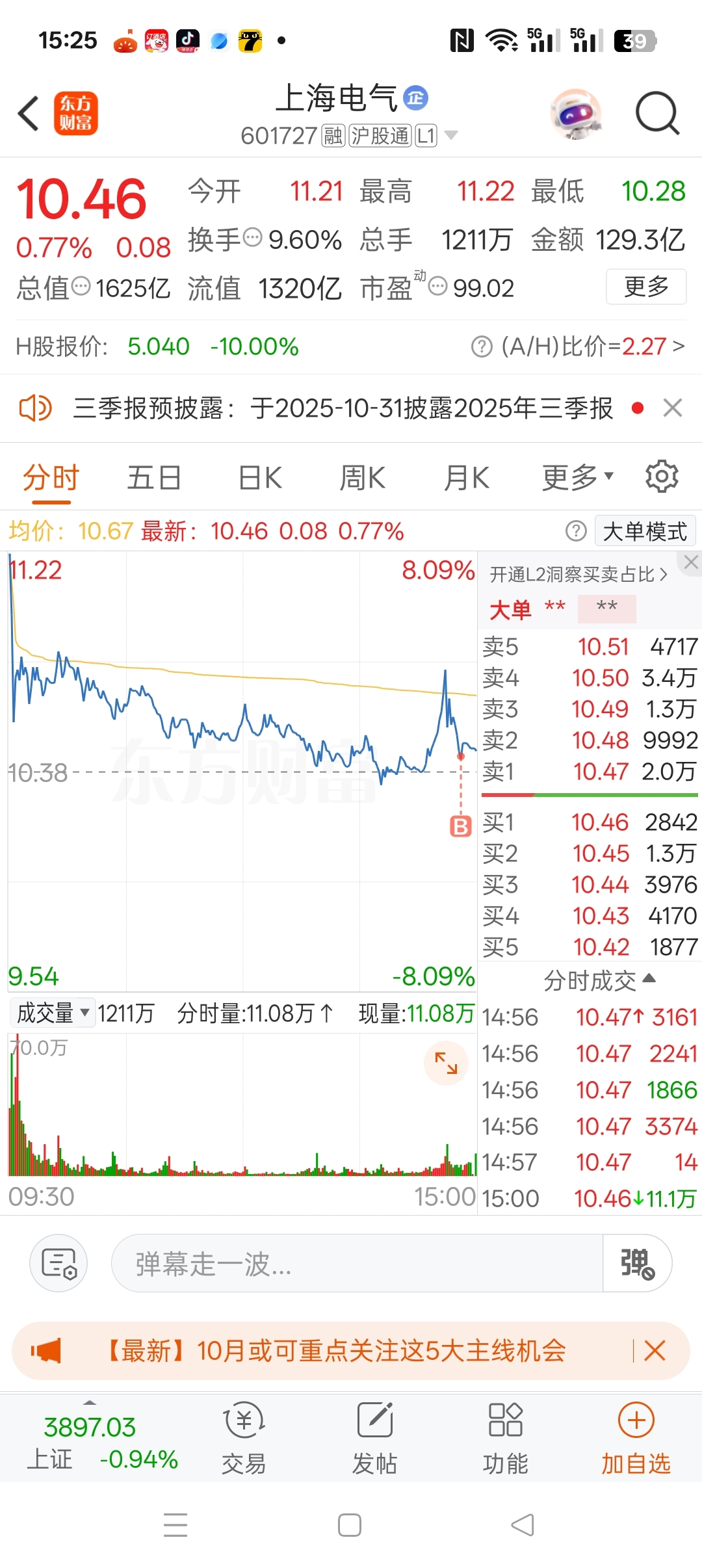 $上海电气(SH601727)$ 冲动了,大盘跌了这么多,本来不应该买的,后面看到拉起来了,想博个涨停的,结果没起来,不知道星期一会怎么样?