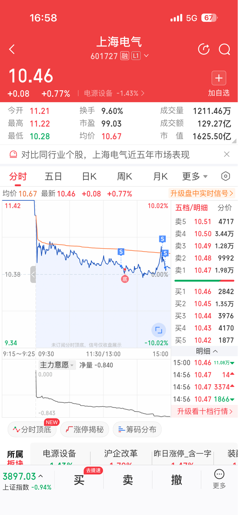 $上海电气(SH601727)$ 今天短线被动减一半仓位,既然主力要清洗,我就顺势而为,期待下星期再战