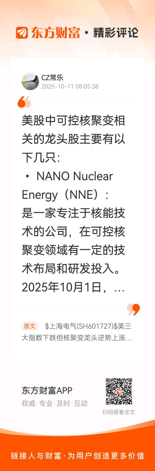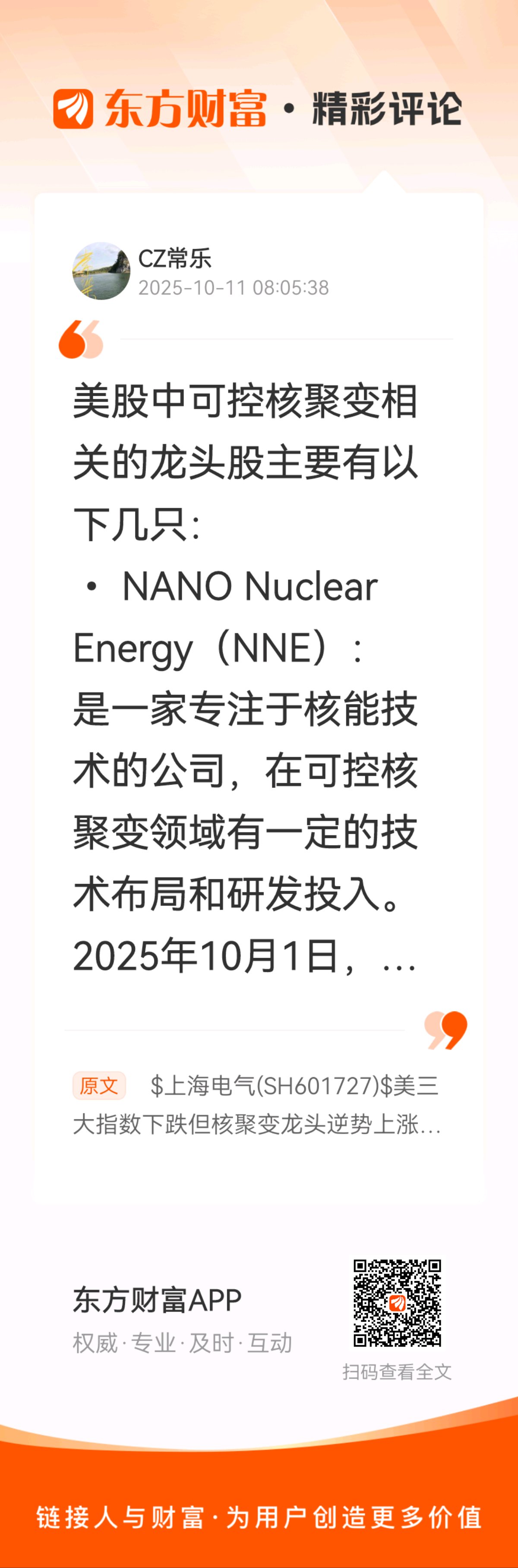//@CZ常乐 :美股中可控核聚变相关的龙头股主要有以下几只:• NANO Nuclear Energy(NNE):是一家专注于核能技术的公司,在可控核聚变领域有一定的技术布局和研发投入。2025年10月1日,该股涨超46%,表现较为突出。• Oklo Inc(OKLO):该公司致力于开发先进的核能技术,其第六代核电站技术(金属钠冷却、模块化设计)在行业内有一定的竞争力,曾因与美国空军达成核电协议,股价大涨30%。• NuScale Power(SMR):是一家专注于小型模块化反应堆技术的公司,其技术在核能领域有一定的优势,在可控核聚变的相关研究和应用方面也有一定的涉足,2025年5月26日,该股涨超19%。• Lightbridge(LTBR):在核能领域有多年的经验,专注于核燃料技术的研发和创新,其技术可能对可控核聚变的发展起到一定的支持作用。2025年5月26日,该股大涨近43%。• Centrus Energy(LEU):是一家主要从事浓缩铀生产和销售的公司,在核能产业链中占据重要地位,其业务与可控核聚变的发展也存在一定的关联,2025年5月26日,该股涨超21%。