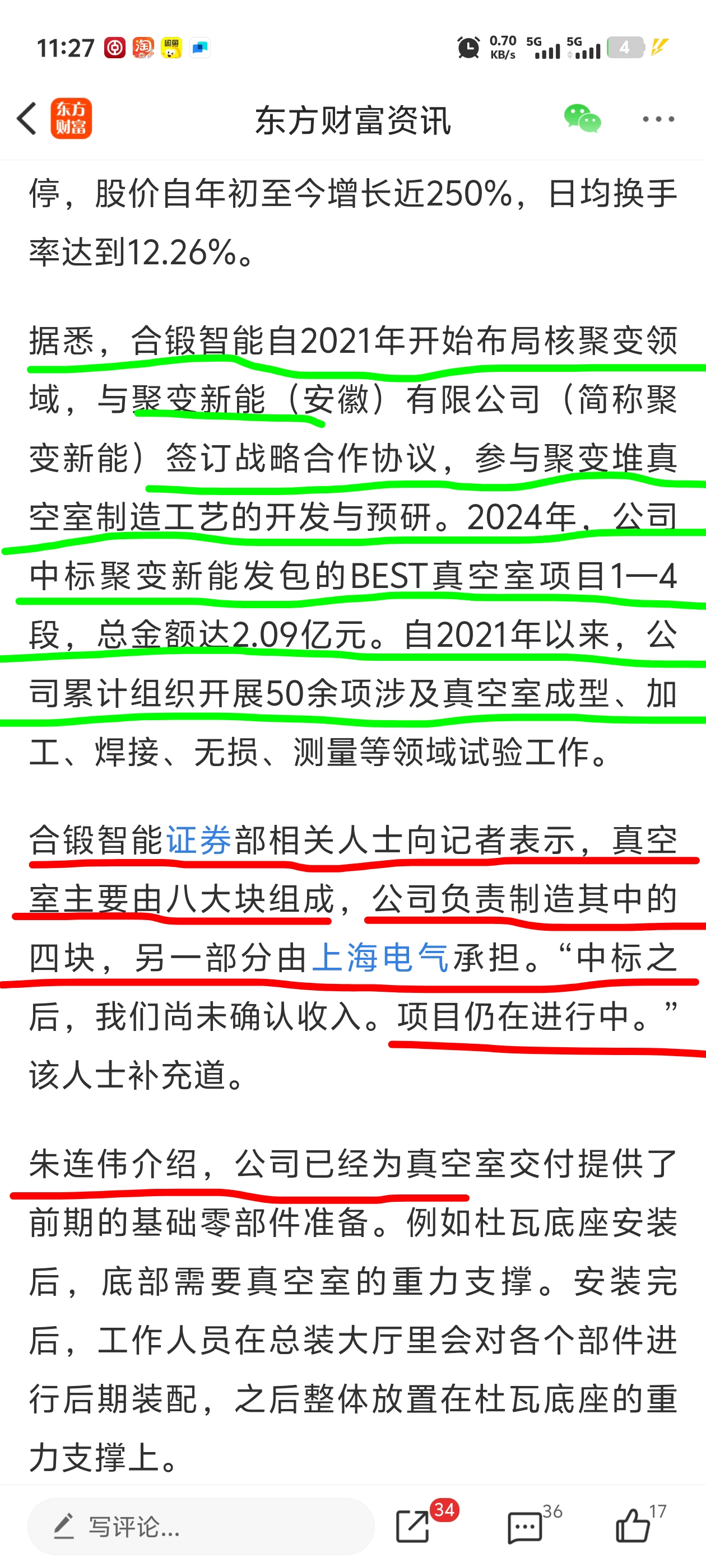 $上海电气(SH601727)$ 据悉,合锻智能自2021年开始布局核聚变领域,与聚变新能(安徽)有限公司(简称聚变新能)签订战略合作协议,参与聚变堆真空室制造工艺的开发与预研。2024年,公司中标聚变新能发包的BEST真空室项目1—4段,总金额达2.09亿元。自2021年以来,公司累计组织开展50余项涉及真空室成型、加工、焊接、无损、测量等领域试验工作。合锻智能证券部相关人士向记者表示,真空室主要由八大块组成,公司负责制造其中的四块,另一部分由上海电气承担。“中标之后,我们尚未确认收入。项目仍在进行中。”该人士补充道。朱连伟介绍,公司已经为真空室交付提供了前期的基础零部件准备。例如杜瓦底座安装后,底部需要真空室的重力支撑。安装完后,工作人员在总装大厅里会对各个部件进行后期装配,之后整体放置在杜瓦底座的重力支撑上。