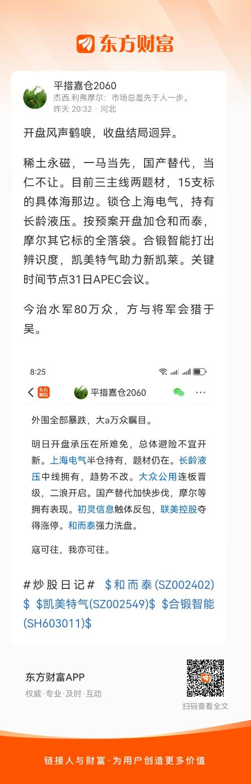 稀土永磁,一马当先,国产替代,当仁不让。目前三主线两题材,15支标的具体海那边。锁仓上海电气,持有长龄液压。按预案开盘加仓和而泰,摩尔其它标的全落袋。合锻智能打出辨识度,凯美特气助力新凯莱。关键时间节点31日APEC会议。