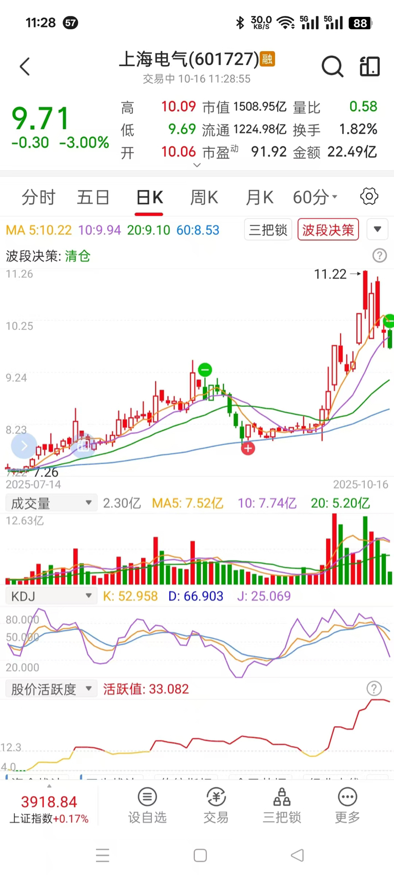 $上海电气(SH601727)$ 短线可以走了,大盘缩量上涨,随时可能大回调,这股可能随时到9.4,没有格局而言,20号十五五大会,十一月中美谈判出结果,资金都在防御板块。下个月估计选择方向。