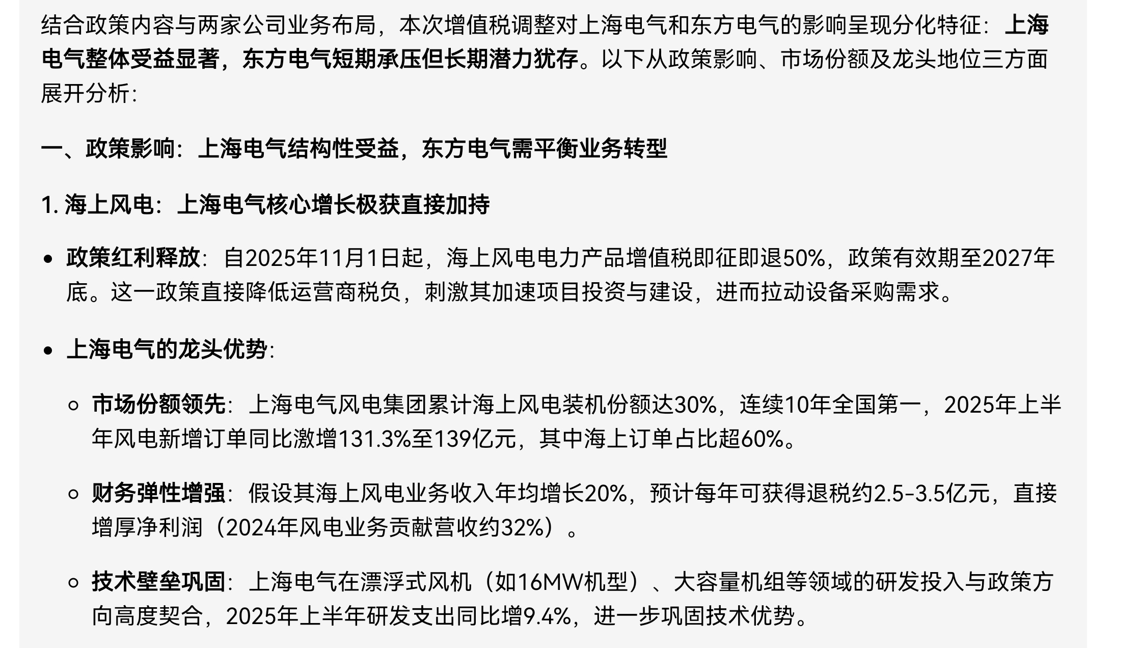 $上海电气(SH601727)$ 人工智能的尽头是算力,算力的尽头是电力,deepseek,豆包的结果。个人愚见:财政部三部委的政策显然是引导各厂商向海上风电方向加大投入,那么收益方必定是海上风电占比体量最大的上海电气,可惜的是本周我把一半以上的仓位换到了东方电气?上海电气缩量下跌四天合计十几个点,原来是洗散户,如果周一上海电气高开不多,周一要不要开盘把东方电气的仓位切换回来上海电气?