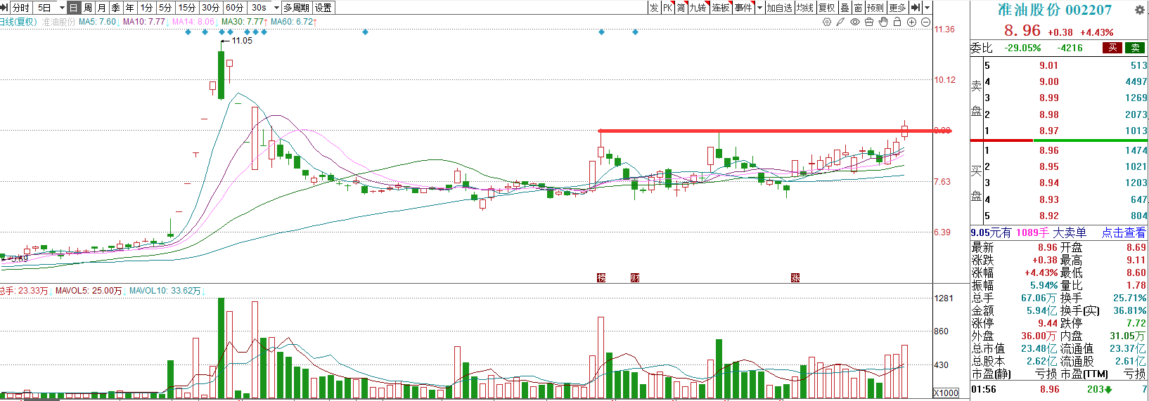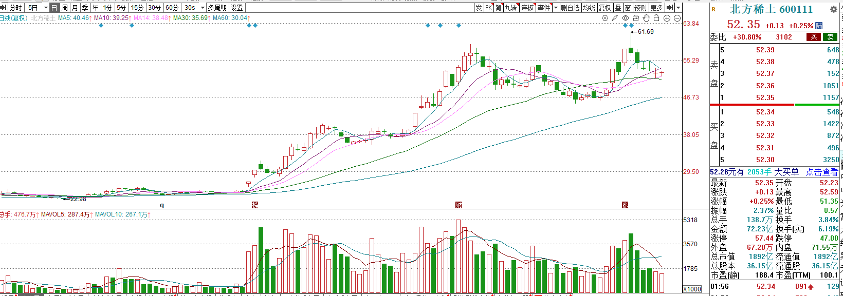本月已经是第二次看好它了,在月初也是成功拿到了一个板。北方稀土在稀土板块中是核心龙头,辨识度非常高。公司是全球规模最大,效益最好的稀土企业,轻稀土配额占比超70%,可见行业影响力非常高。基本面非常好,随着今年稀土价格不断攀升,上半年业绩也大幅增长。中美即将开启新一轮贸易谈判,焦点还是在稀土,消息面也将带动板块走强。再看技术面,经过了短线快速回落,板块调整比较充分。在14天线上方连续收出两根小十字星阳线,这是企稳信号。今天若能放量站上十天线上方,短线反弹就比较明朗了。策略是在五日线上方研究,若还是横盘震荡还要继续观察。