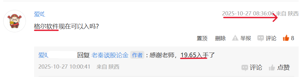 $格尔软件(SH603232)$:早盘量子科技率先发动攻击,受昨晚利好刺激,但大科技高开后承压,量子也纷纷回落,出击这只辨识度票在逻辑上没问题,但盘面因素不可控,老秦接受。前两天有老铁问到过老秦能不能入格尔,老秦当时手里跟踪的“后宫”好票太多,实在没顾上“翻它的牌子”。看来这票跟咱们缘分还没到啊!也恭喜这位吃上肉的兄弟!
