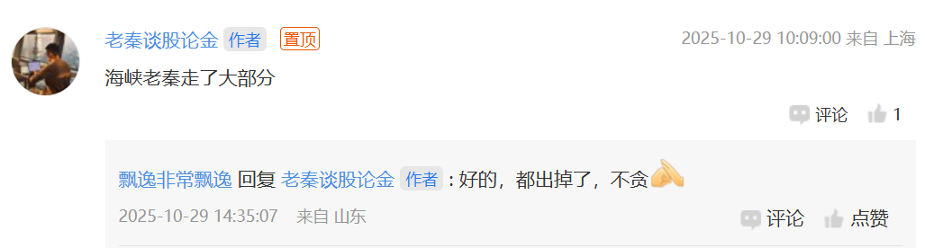 $海峡创新(SZ300300)$:早盘冲高后,开始逐渐减仓,因为盘前说了,只有大幅高开才有摸3板的能力。另外,福建竞价是符合预期的,但开盘后刷刷的回落刹跌,作为高度板,这票会因此而承压,毕竟已经涨了50%多了,远高于平潭的涨幅了。本来准备留点苍位的,下午这走势还是果断给清空了。老秦这单拿下40点加,前天一起的朋友也都相仿的收益了,这单非常爽!