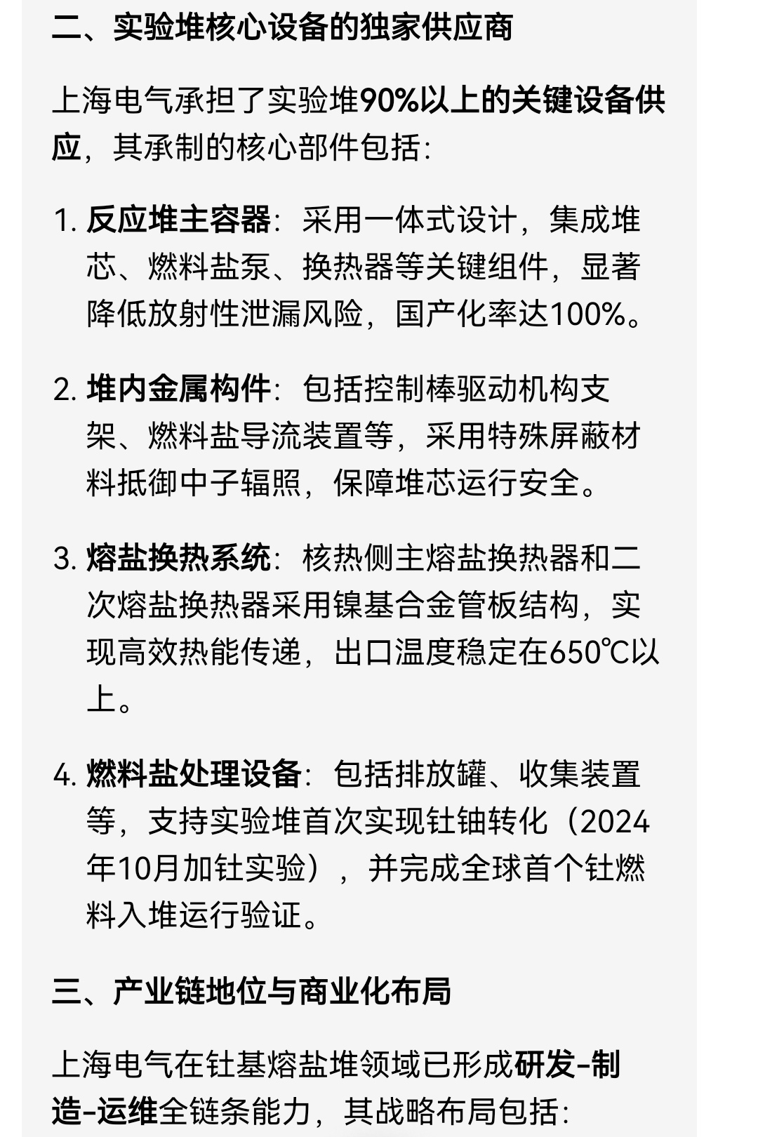 $上海电气(SH601727)$ 钍基熔盐实验堆建成,首次实现钍铀转换,核心设备完全国产化。这个消息最利好上海电气和宝色股份。炒完核聚变“人造太阳,该来钞钍基熔盐堆了。这个商业化进展2027年,看着靠谱点,离现实近一点,2050年的核聚变商业化有点远。