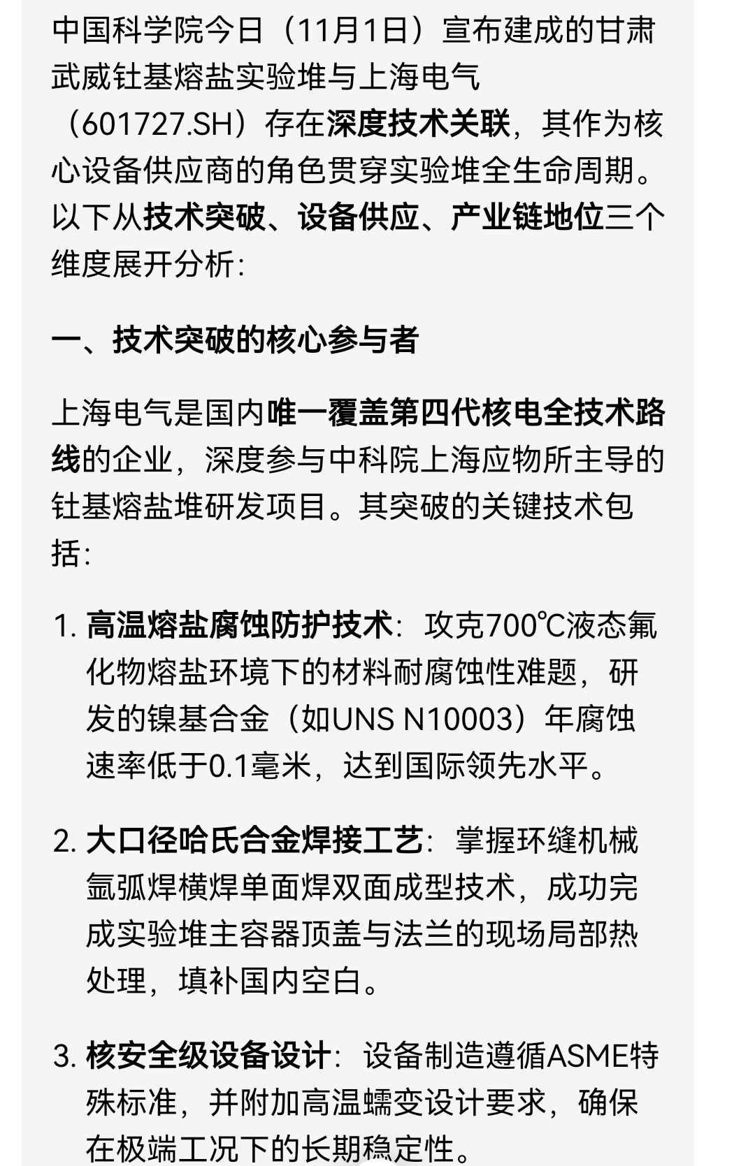 钍基熔盐实验堆建成,首次实现钍铀转换,核心设备完全国产化。这个消息最利好上海电气