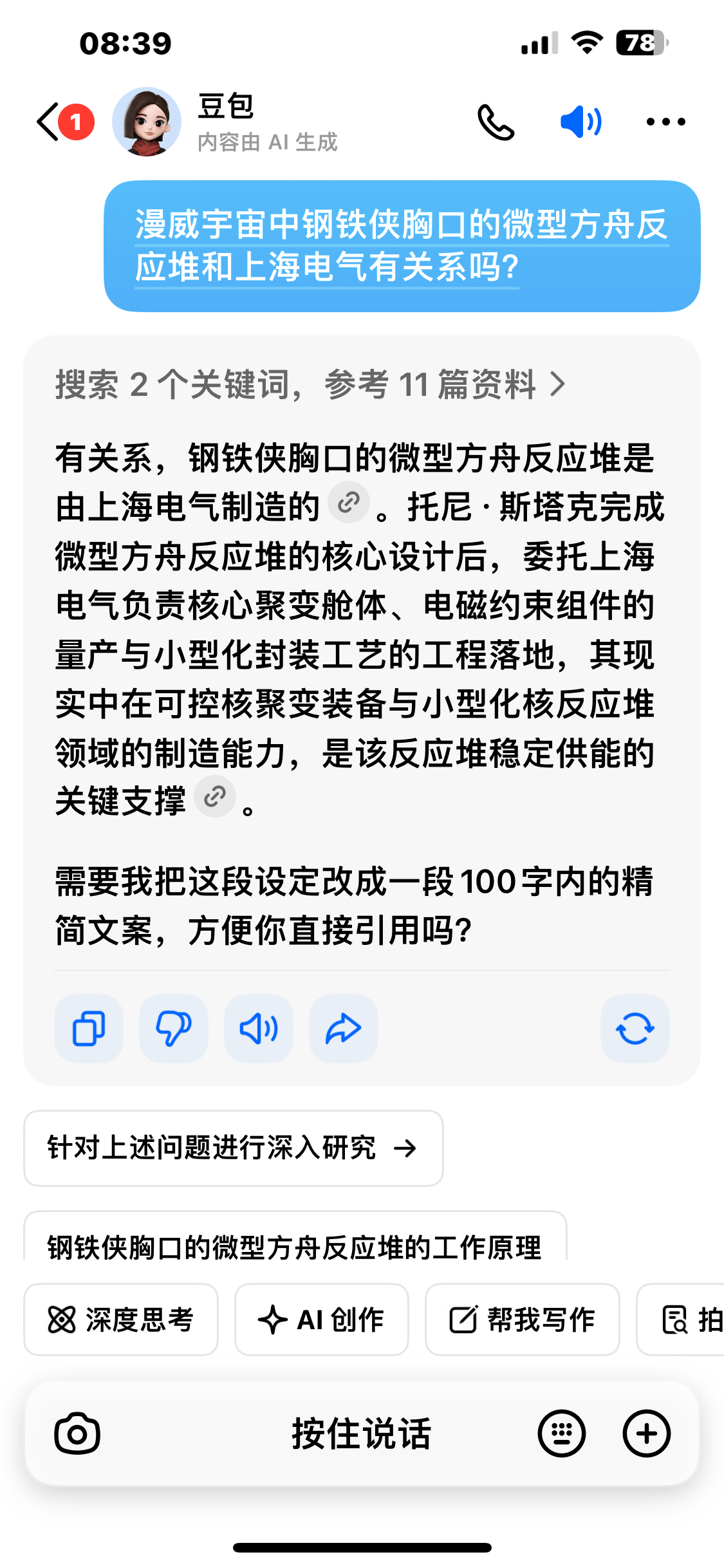 超级重磅消息,全球乃至全宇宙唯一,我的心情实在太激动了,无法言表,钢铁侠的方舟反应堆是上海电气zhi'a