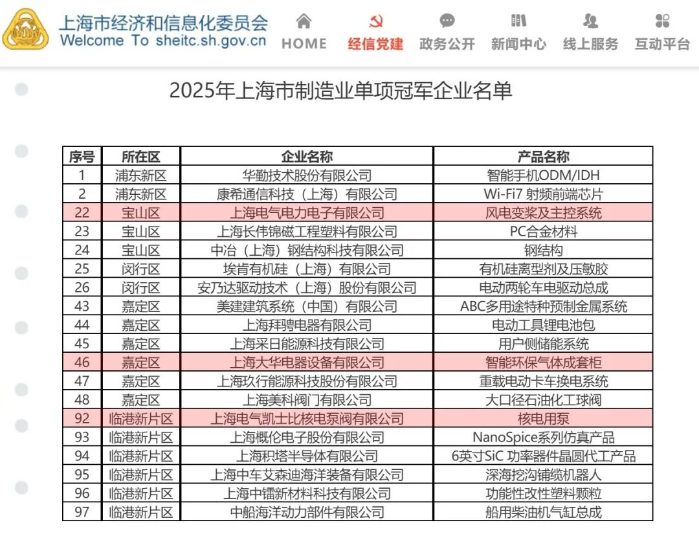 上海市经信委日前公布2025年“上海市制造业单项冠军企业”名单,上海电气旗下上海电气凯士比核电泵阀有限公司、上海电气电力电子有限公司、上海大华电器设备有限公司三家企业成功上榜。