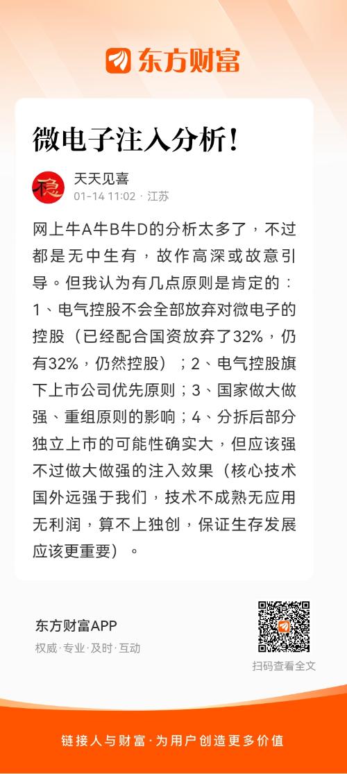 网上牛A牛B牛D的分析太多了,不过都是无中生有,故作高深或故意引导。但我认为有几点原则是肯定的:1、电气控股不会全部放弃对微电子的控股(已经配合国资放弃了32%,仍有32%,仍然控股);2、电气控股旗下上市公司优先原则;3、国家做大做强、重组原则的影响;4、分拆后部分独立上市的可能性确实大,但应该强不过做大做强的注入效果(核心技术国外远强于我们,技术不成熟无应用无利润,算不上独创,保证生存发展应该更重要)。