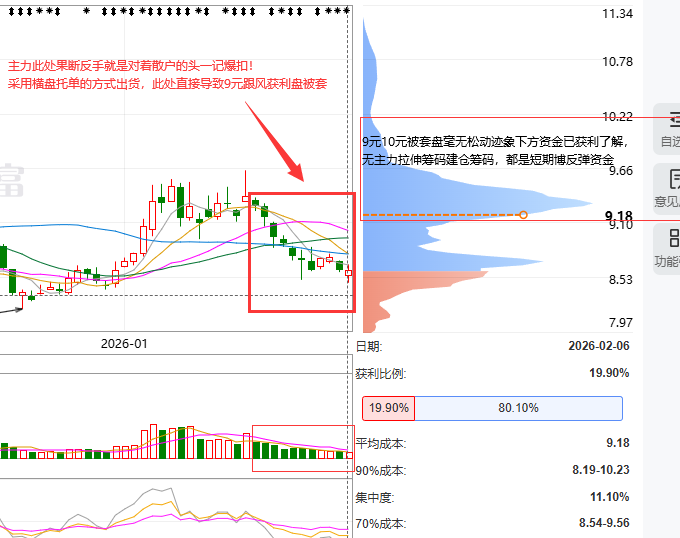 《图文技术分析贴拒绝废话》目前从筹码峰来看9.3-9.5的套牢盘实在太多了!而且一路下跌下来越套越多,说明有很多割肉半仓的把成本推高,底部筹码未见增长,只是陆续进来进来了一些博弈短期反弹的偷鸡资金,