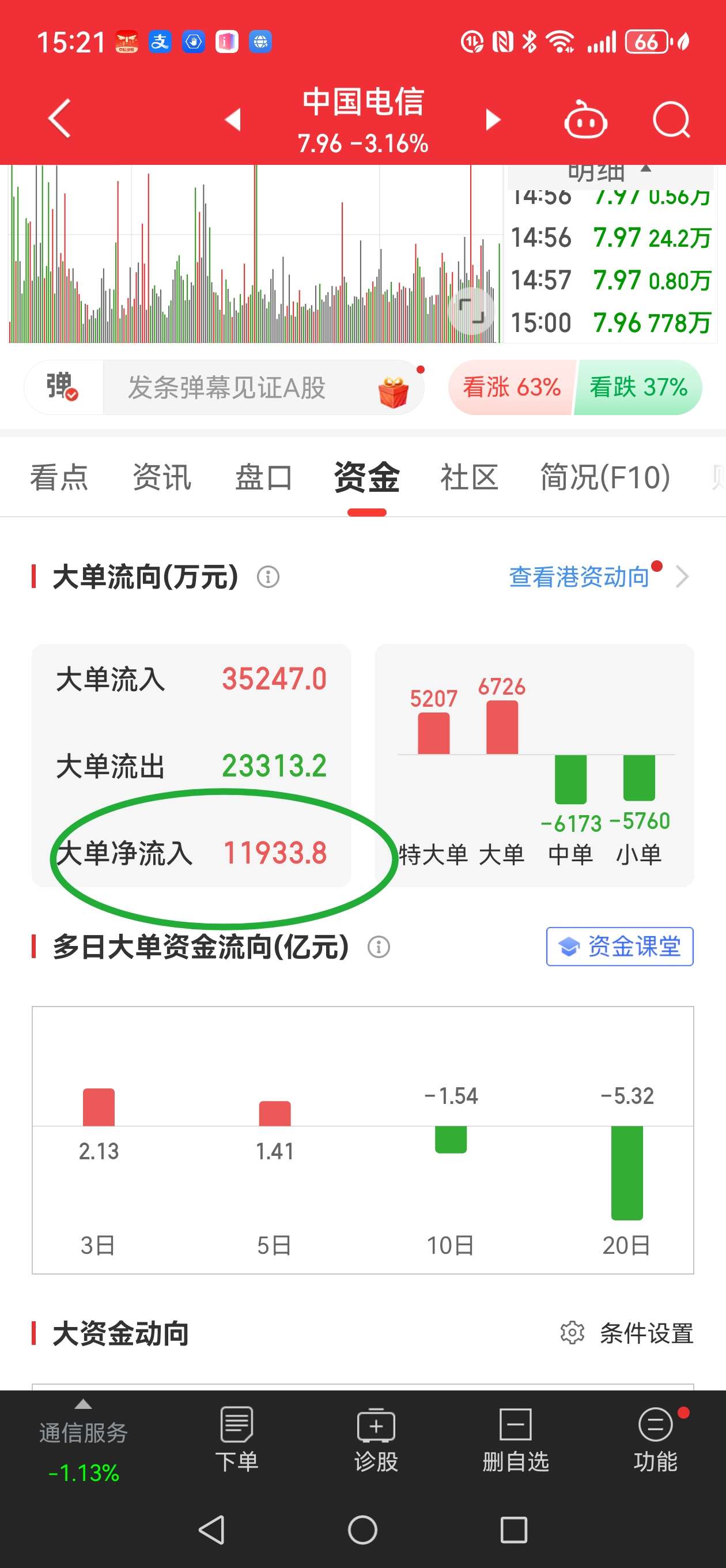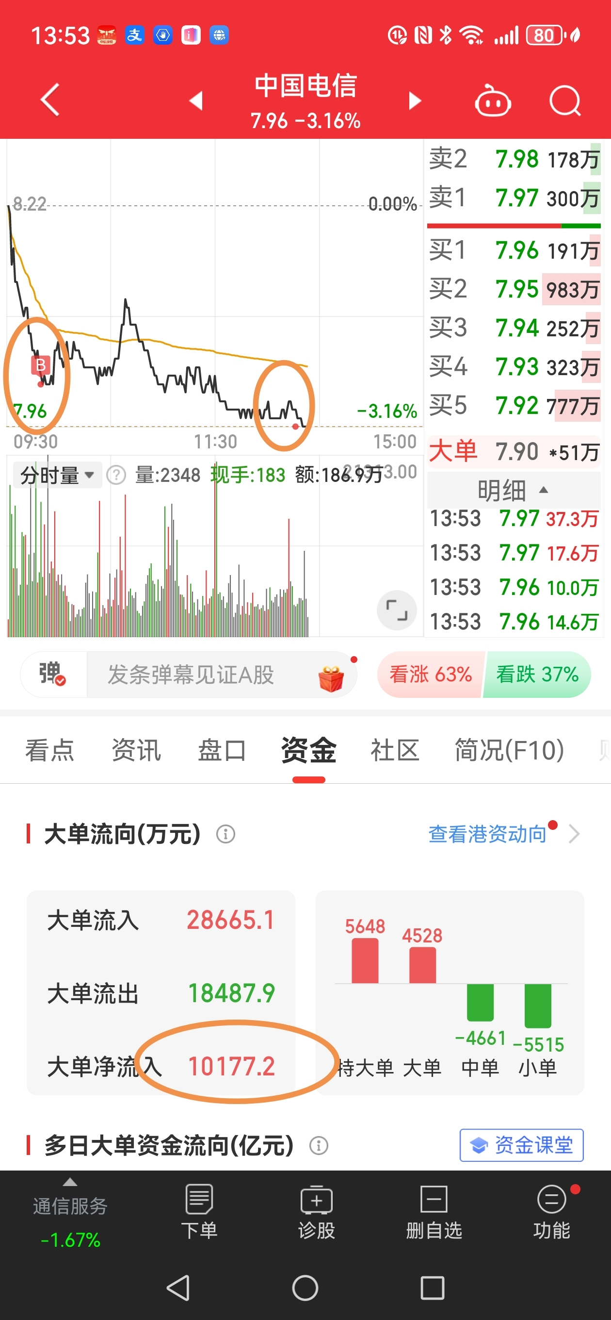 $中国电信(SH601728)$ 买不完根本就买不完,今天跌超过2个点8.01补仓,然后7.96又补一次仓。今天怪啦,主力资金一直在净流入,股价却不涨。
