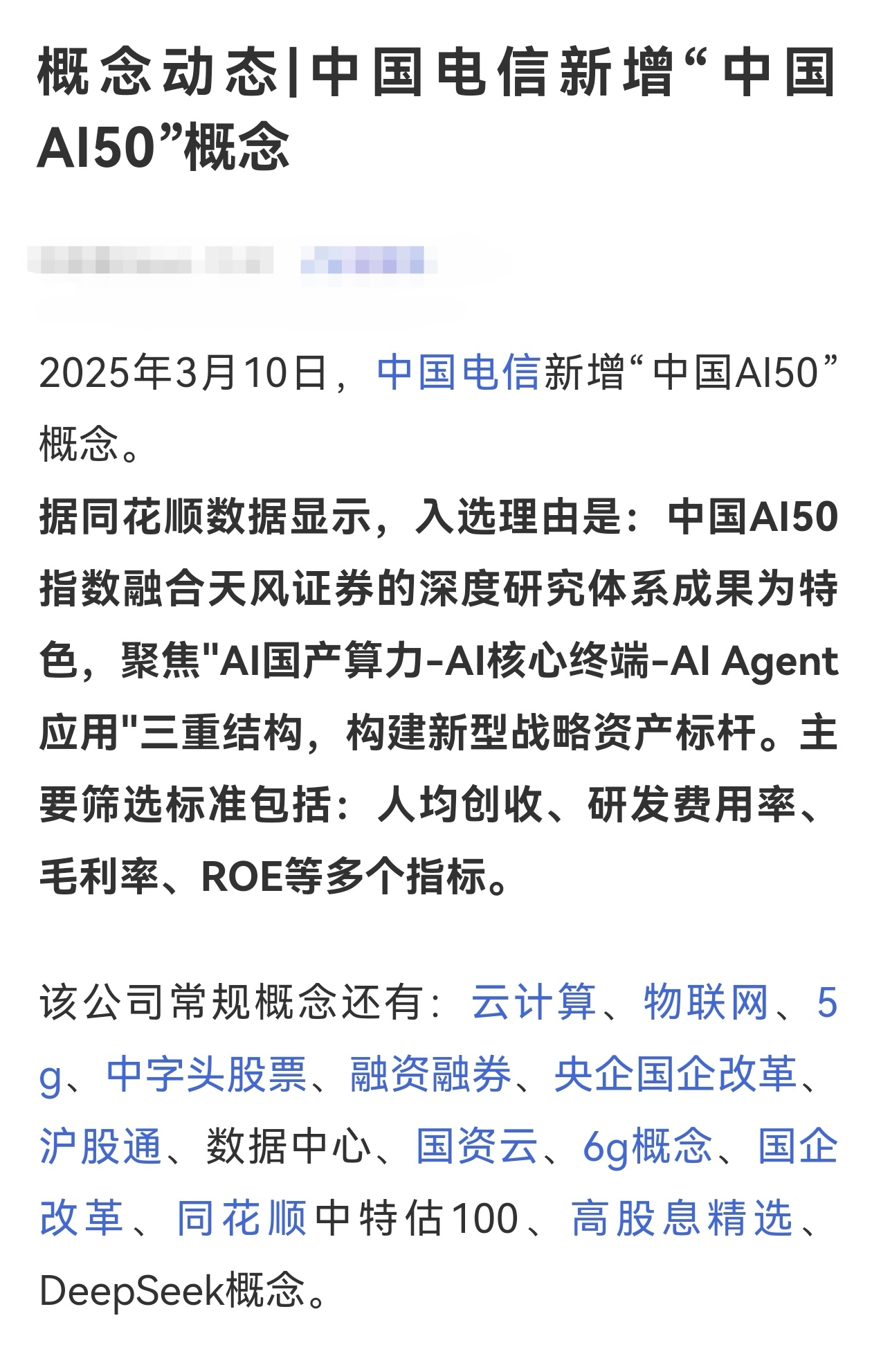 中国电信被列入中国AI50概念股