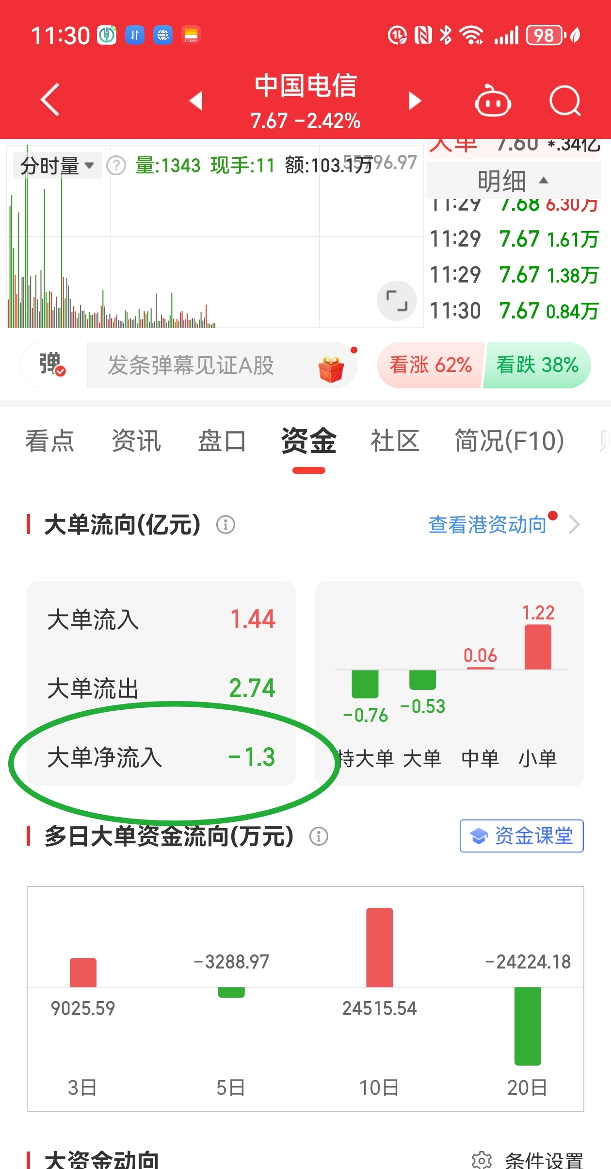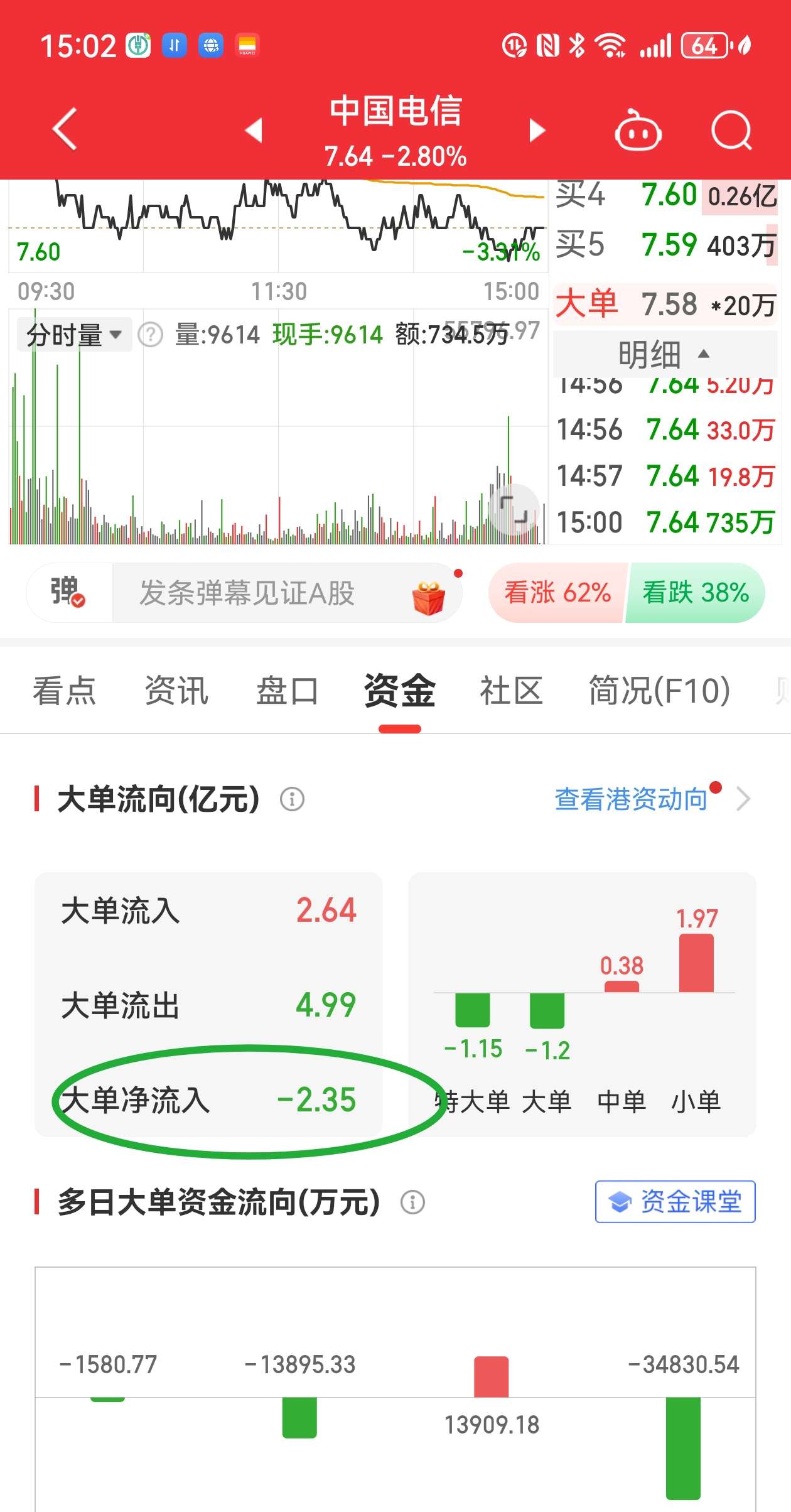 $中国电信(SH601728)$ 今天的跌幅有点大啊跌了3个点。主力资金一度净流出1.4亿元,目前净流出1.37亿元。