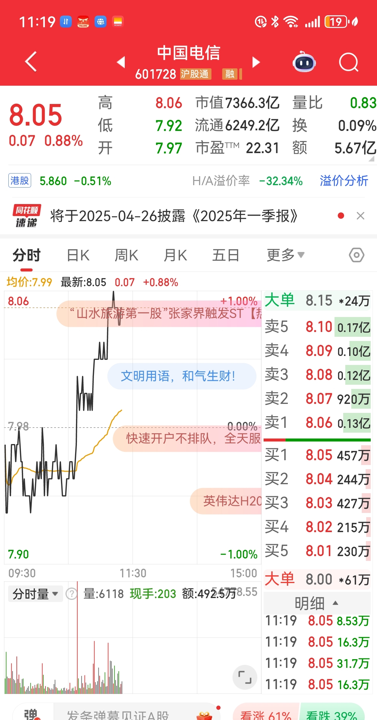 $中国电信(SH601728)$ 今天六大国有银行和中国电信、中国移动护盘有功!电信水面上每涨一分钱都有大的卖单。