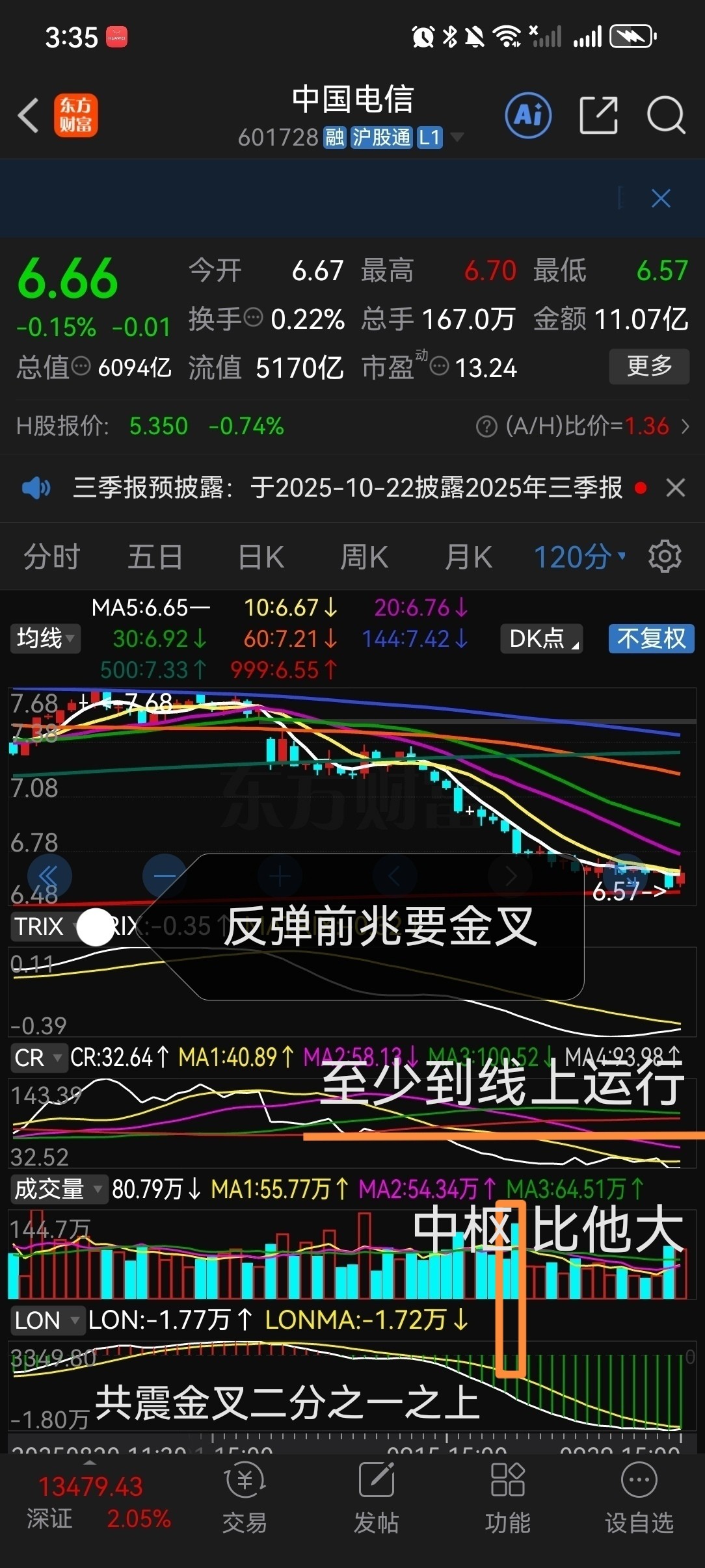 $中国电信(SH601728)$ 基本常识要了解,电信日线KD还在10下方运行,严重钝化期,五日均线都没能力站上,卡位6.57×0.0475=0.312075+6.57=6.882075~6.89元站上10均线了,再观望一段时间,先把摆脱严重钝化度过去,C浪结束6.57×0.11=0.7227+6.57=7.2927~7.3元可以站上60日均线,MACD连续出红柱,两条线会摆脱弱势区,最低的要求不达标,阴跌不止,不要急着抄底,亏的还是时间,抄不好越套越被动,还是观望期!!!