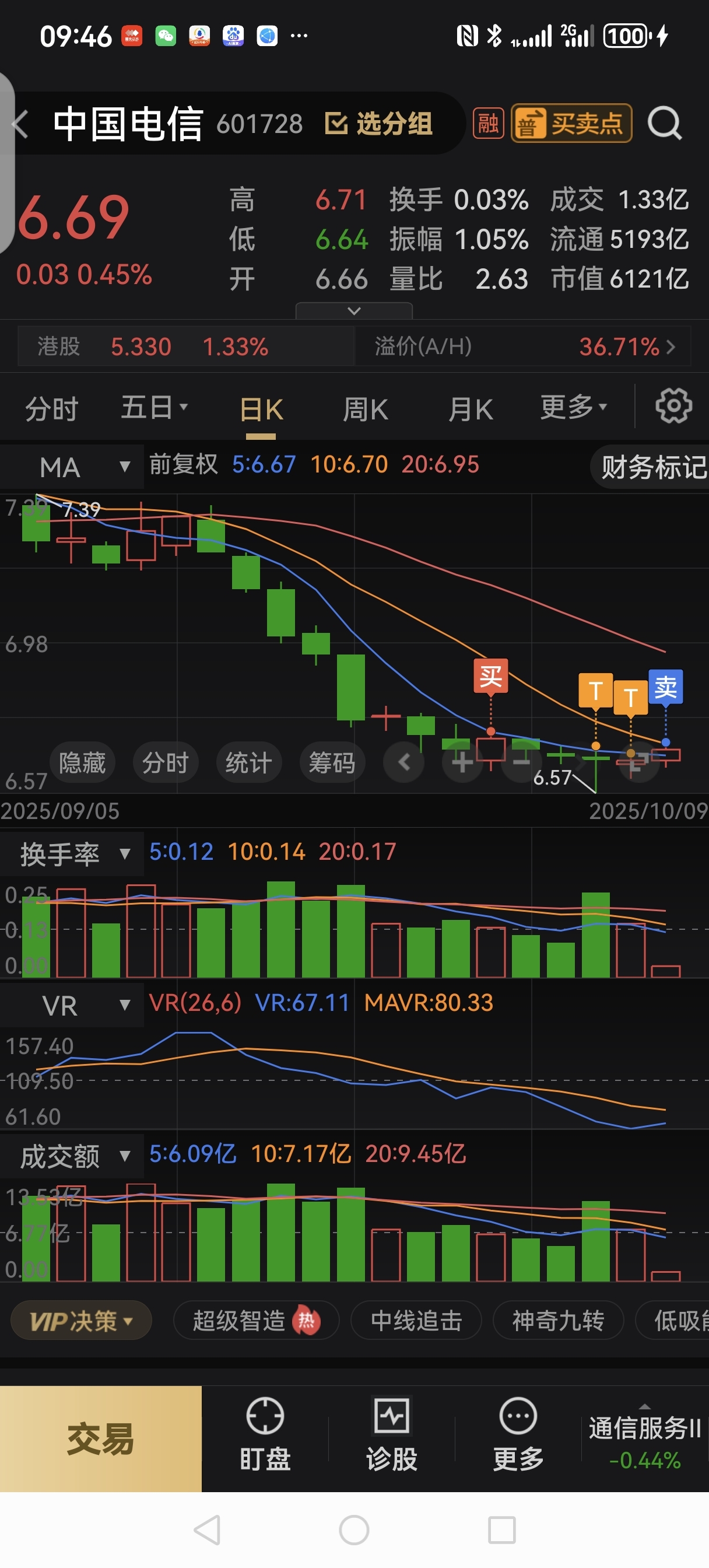 中国电信,10月9号,已清仓6.70(24*53*2)跌下来就买,委托已挂。