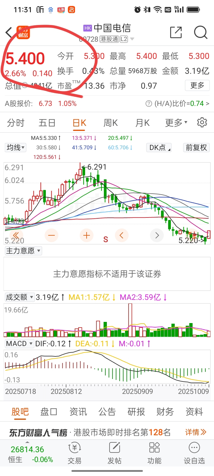 $中国电信(SH601728)$ 你个棒槌,港股都涨了快三个点了