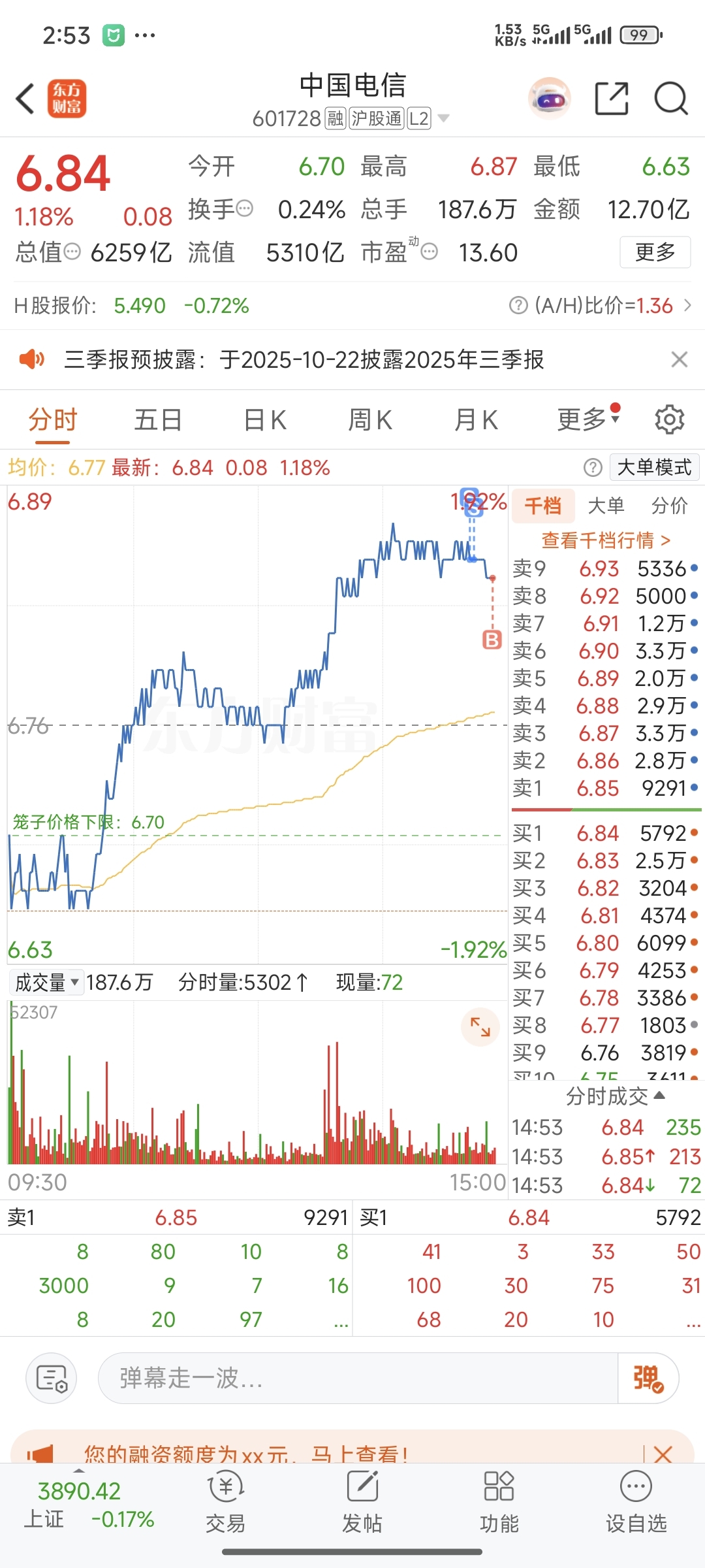 $中国电信(SH601728)$ 我真胆小,怕甩下车,1分钱的T,去掉手续费还剩包烟钱