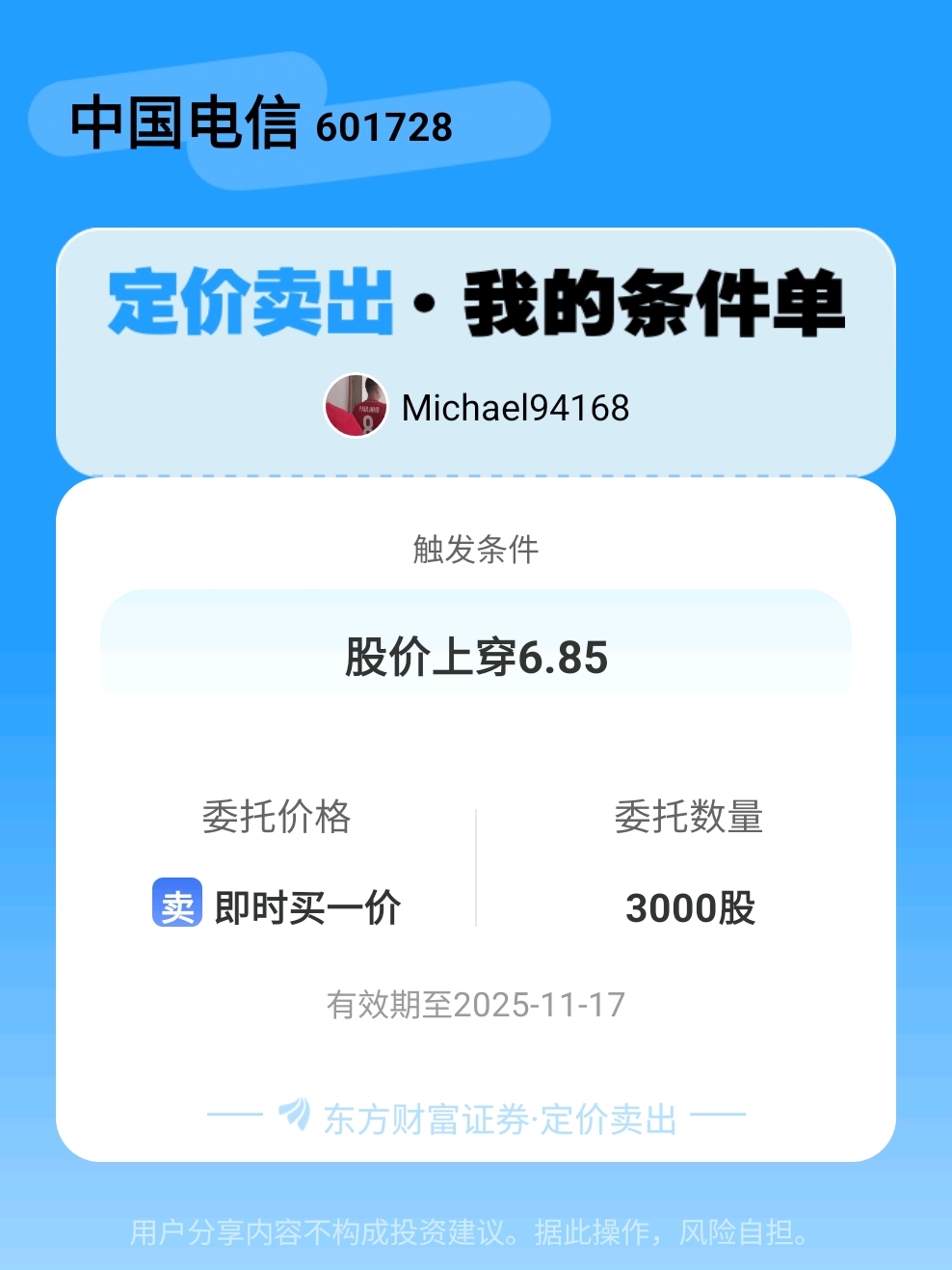 #条件单交流# #定价卖出晒单# 一位股神设置了一个定价卖出条件单,接下来就是见证奇迹的时刻~$中国电信(SH601728)$