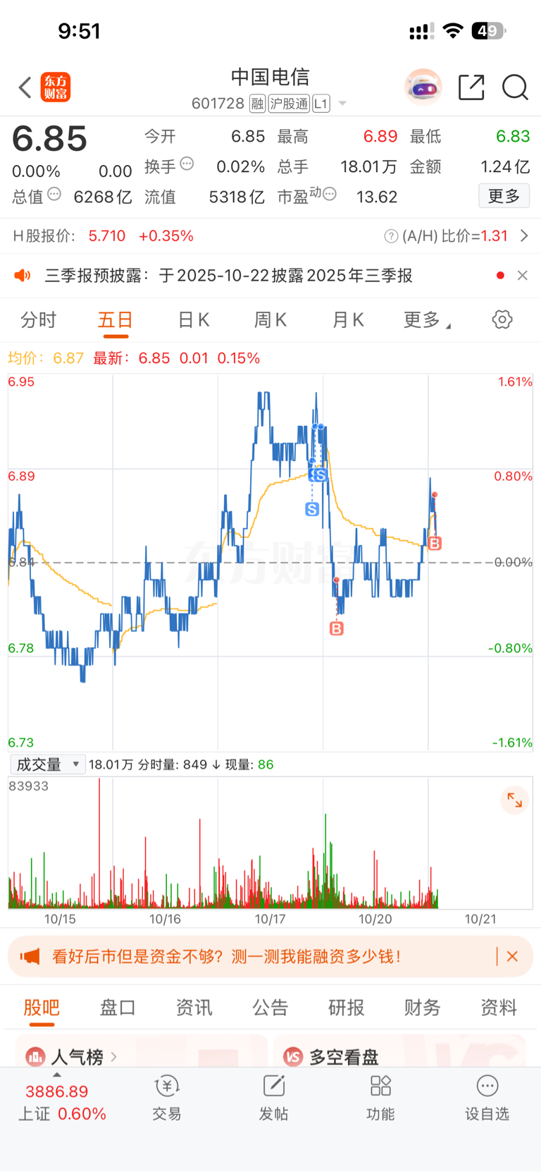 $中国电信(SH601728)$ 一买就崩?