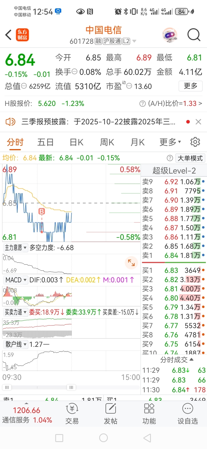 $中国电信(SH601728)$ 补一点,虽然没补到最低点,也知足了。