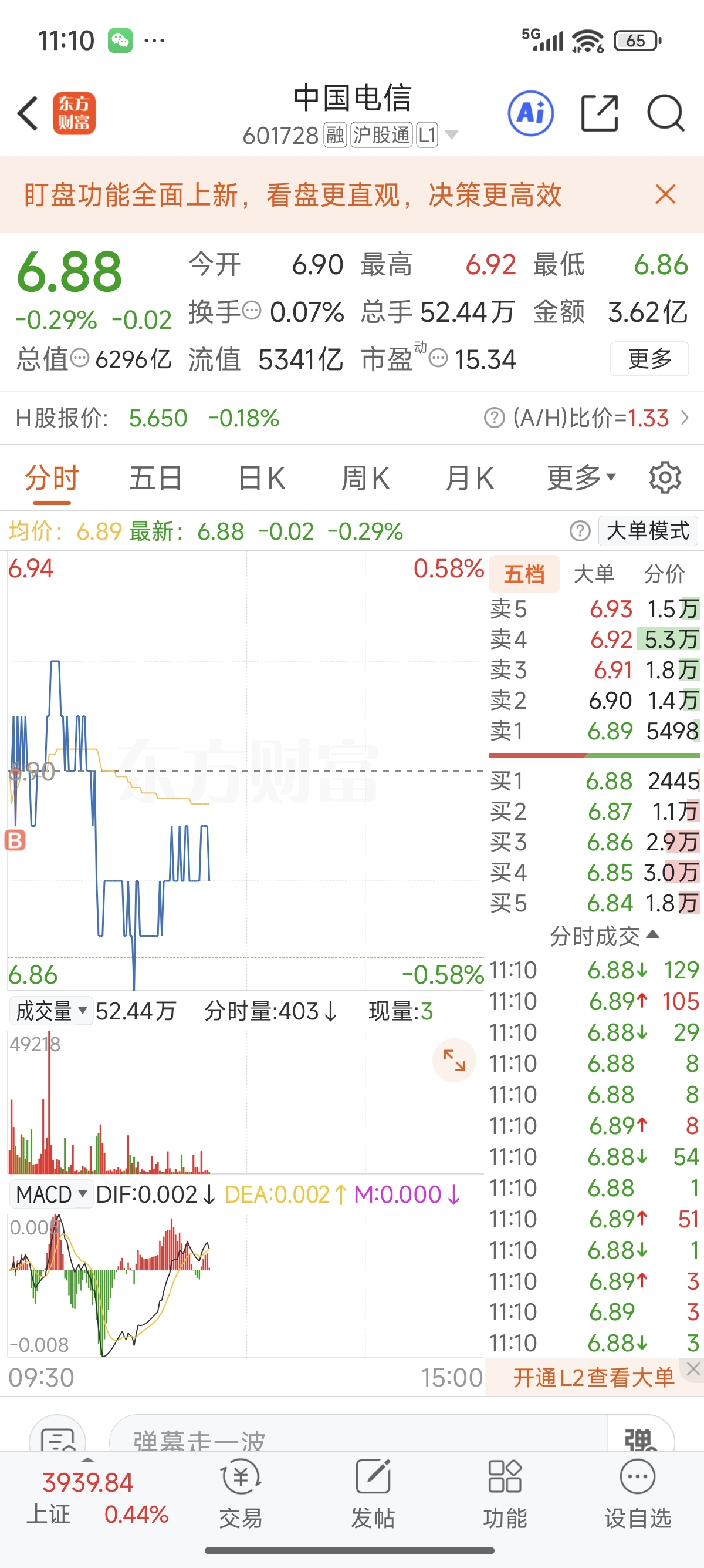 $中国电信(SH601728)$ 意思很明显了,不让过6.92