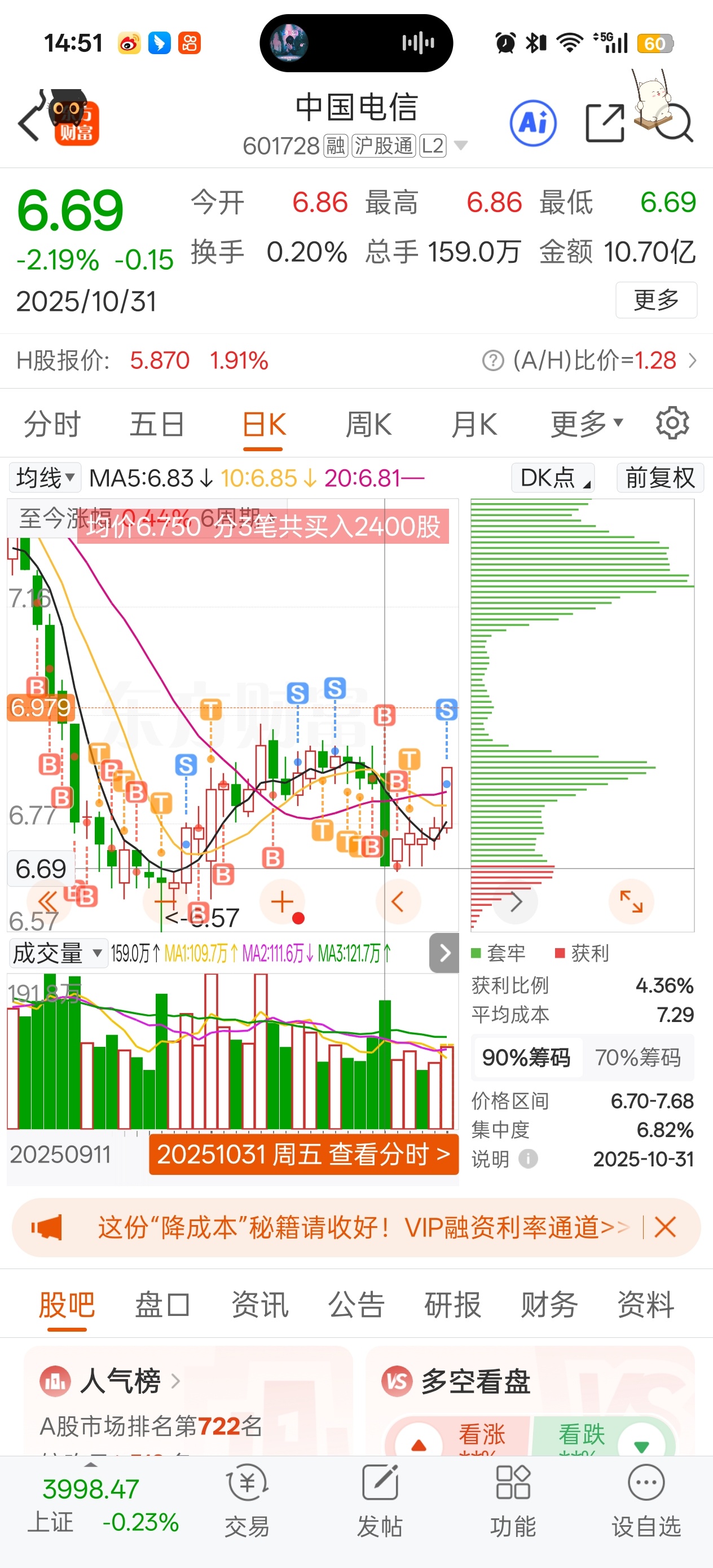 $中国电信(SH601728)$ 主力你今天吃伟哥了吧这么猛,我是看好电信的,但是依旧出了点,因为不得不防你31号的操作啊