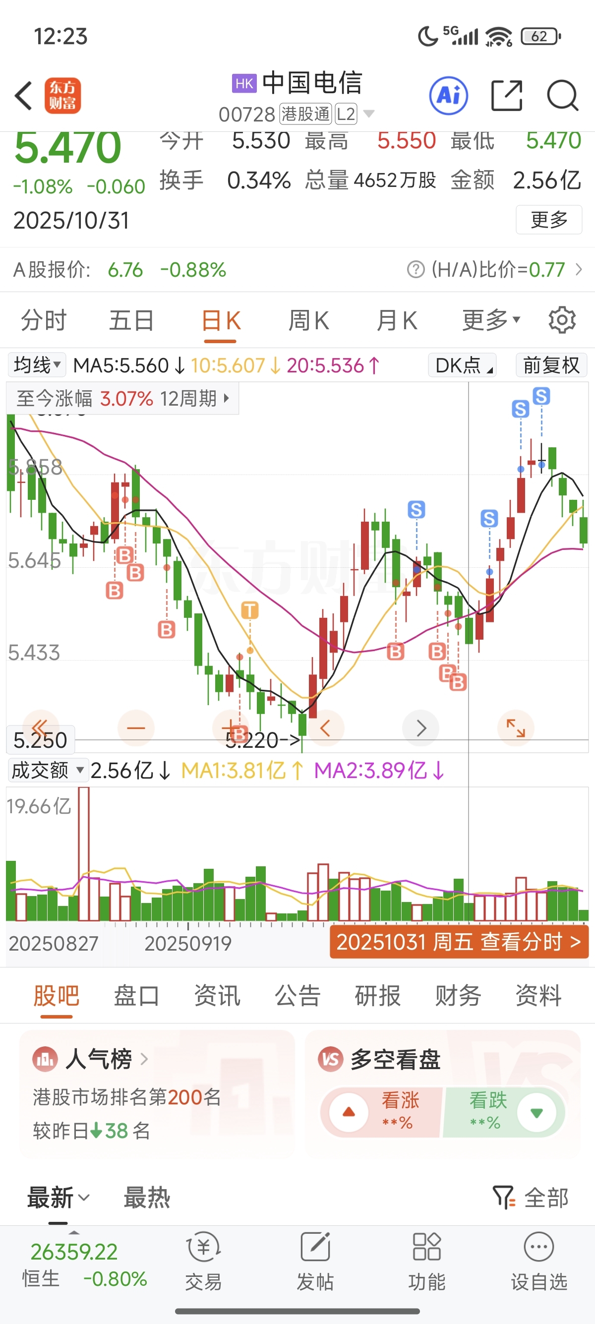 $中国电信(SH601728)$ $中国电信(HK|00728)$ 5.47进一点,5.22进一点差不多了