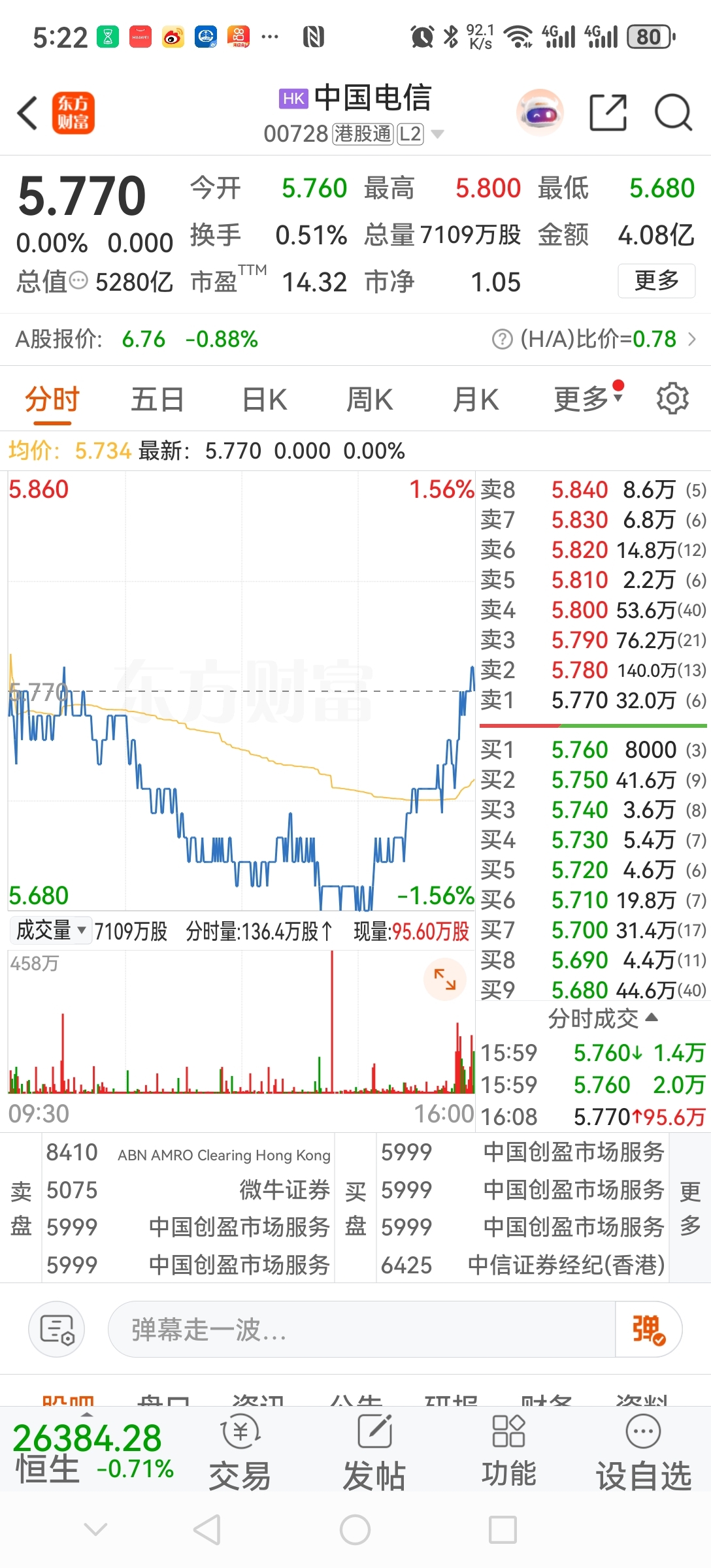 $中国电信(SH601728)$ 港股尾盘反弹了