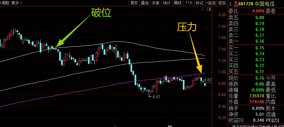 $中国电信(SH601728)$ 近期走势比较弱一些,主要是前期高位回落跌破了白色大均线,没能拉起来了站稳,形成破位走势,并且一直调整到现在也没有明显反弹走势,接下来主要看头上紫色大均线6.98能不能站稳,能站稳就还能继续观察,但迟迟站不稳就又要注意再次破位的风险了,控制仓位应对。