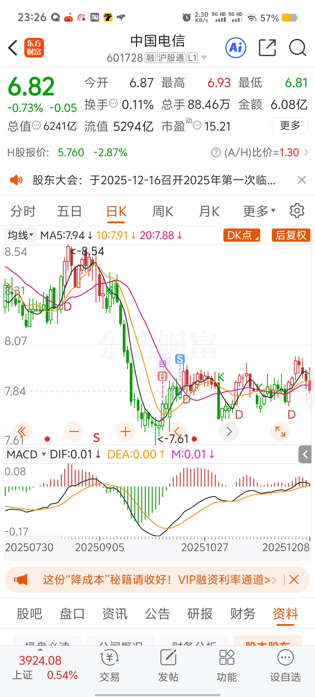 $中国电信(SH601728)$ 再下来一块,这个位置俺不敢来。为了你4%的股息,我担心你下来15%。