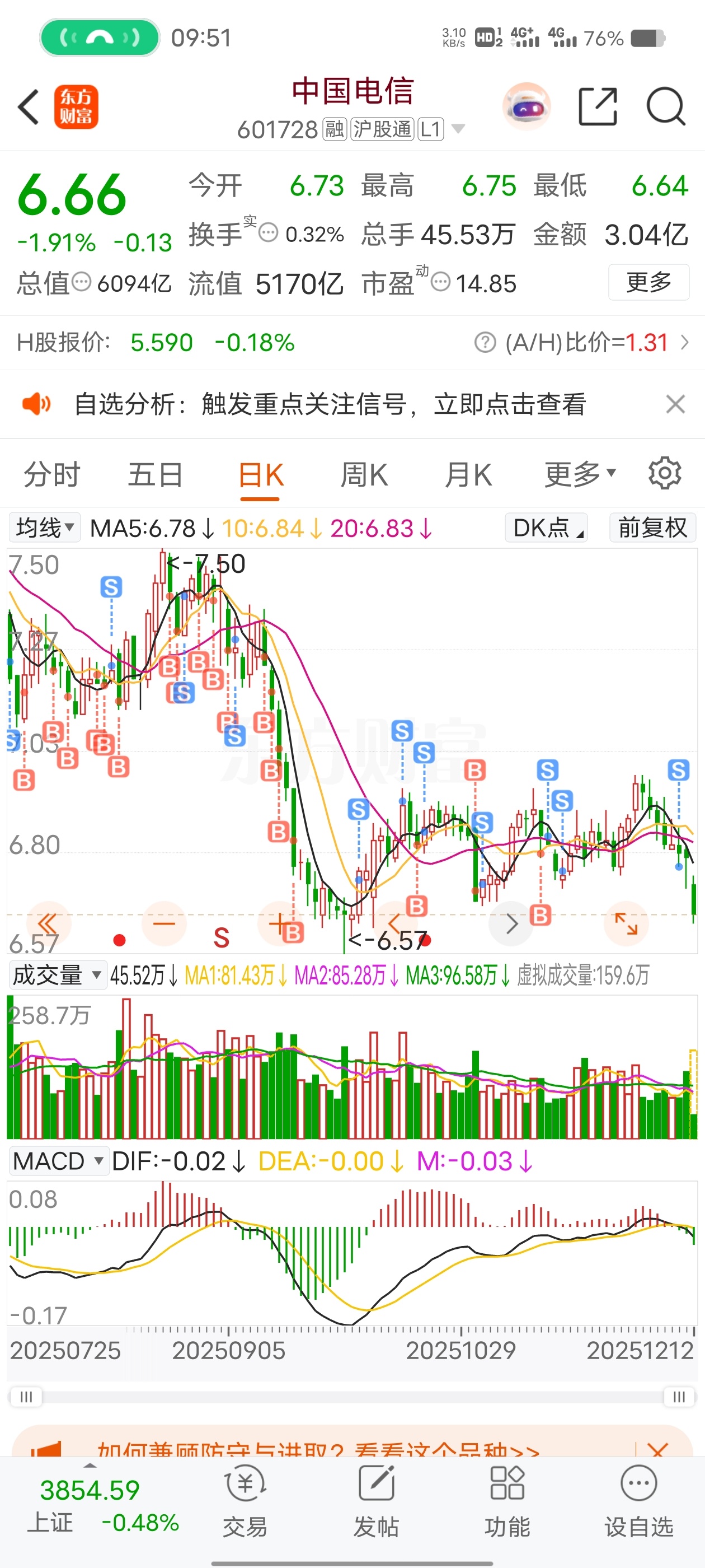 $中国电信(SH601728)$ 3万股在山顶扛下来,前天忍痛割了,亏了3万多认了,再也不碰织布机国企