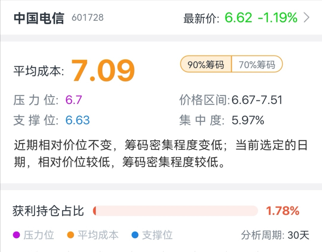 $中国电信(SH601728)$ 大绿棒子,尾盘砸得这么凶!!!连跌九天最低价6.62元收市,跌破了支撑位!看来一路向下,没有最低,只有更低!近三十天的98.22%交易者同我一样都是亏钱的