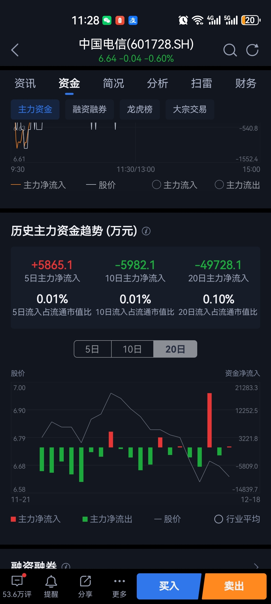 $中国电信(SH601728)$ 跌4天然后平盘一天,又继续跌四天,前天红一天,估计又要跌四天了