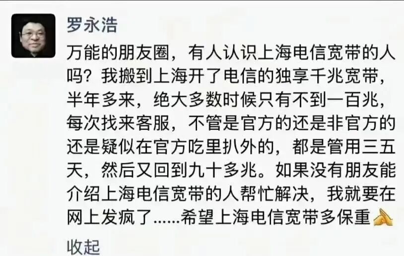 罗永浩吐槽 “我就要在网上发疯了”!上海电信回应
