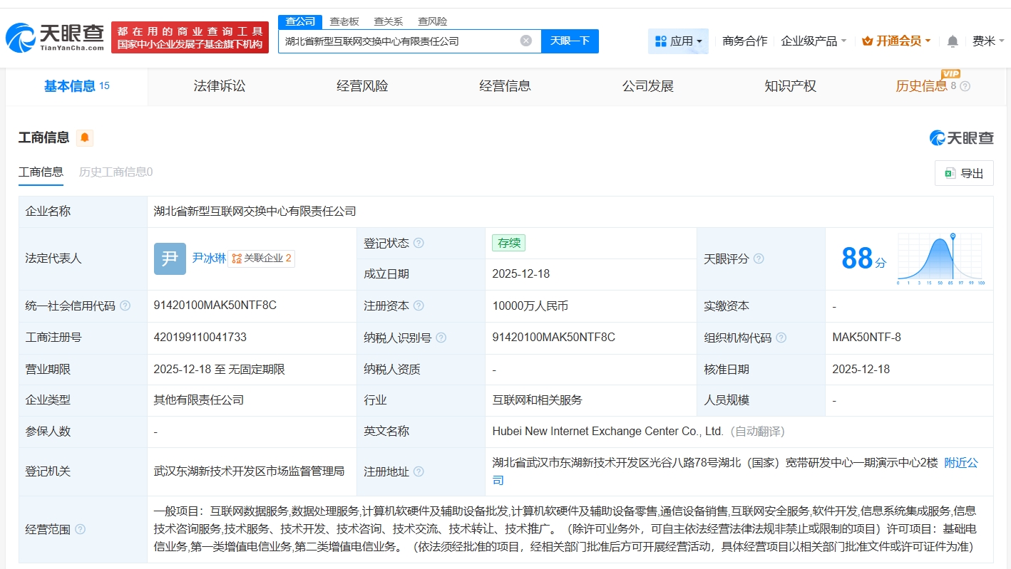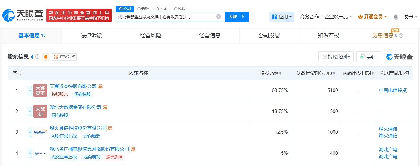 每经AI快讯,天眼查App显示,近日,湖北省新型互联网交换中心有限责任公司成立,法定代表人为尹冰琳,注册资本1亿元人民币,经营范围包括互联网数据服务、数据处理服务、计算机软硬件及辅助设备批发、计算机软硬件及辅助设备零售等,由中国电信(601728)旗下天翼资本控股有限公司、湖北大数据集团有限公司、烽火通信(600498)、湖北广电(000665)共同持股。
