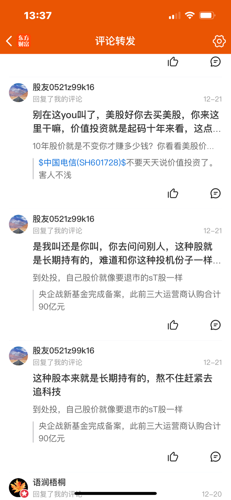 $中国电信(SH601728)$ 一起来喷。还价值投资呢。投。买啥不赚钱啊??在这里一年跌几个点。你还自豪上了