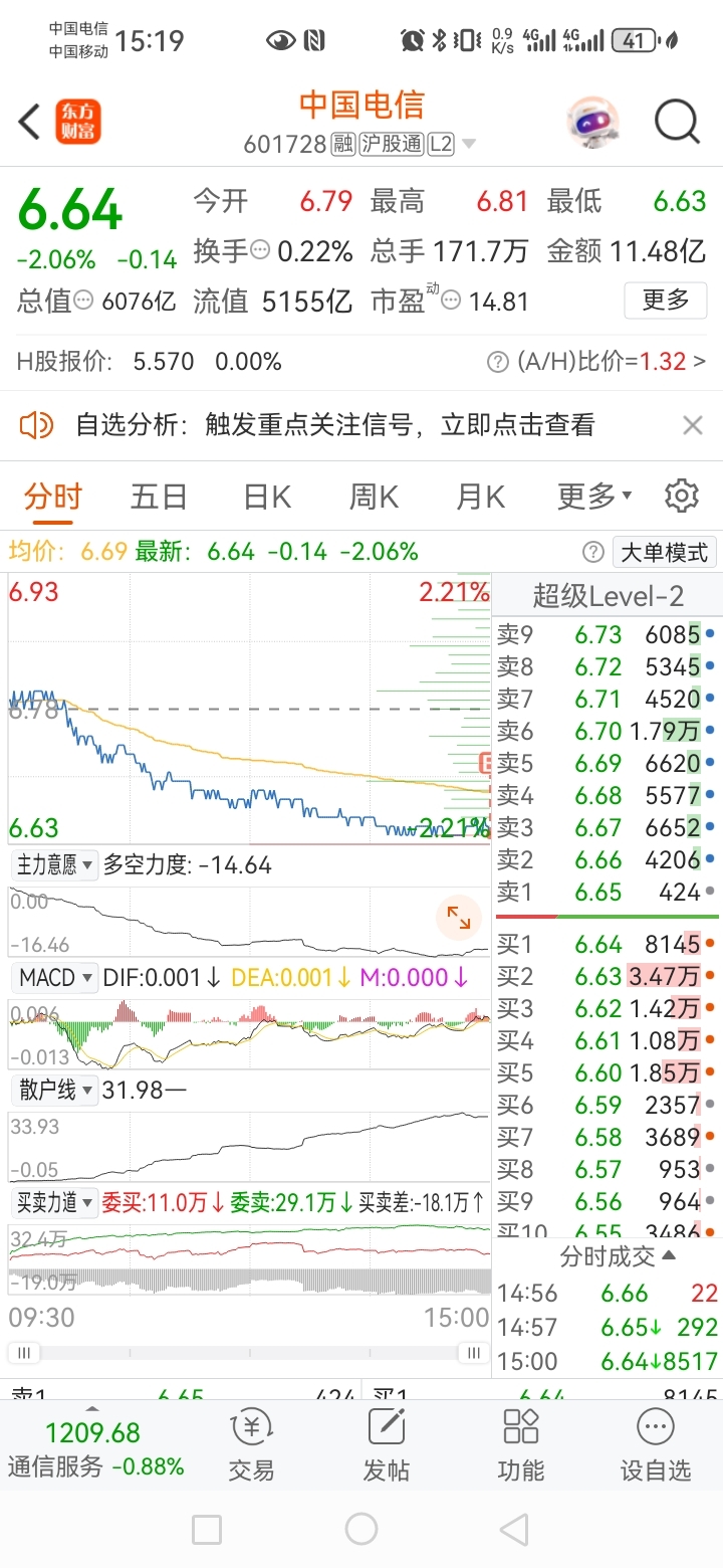 $中国电信(SH601728)$ 尾盘竞价买入,港股还没走坏。