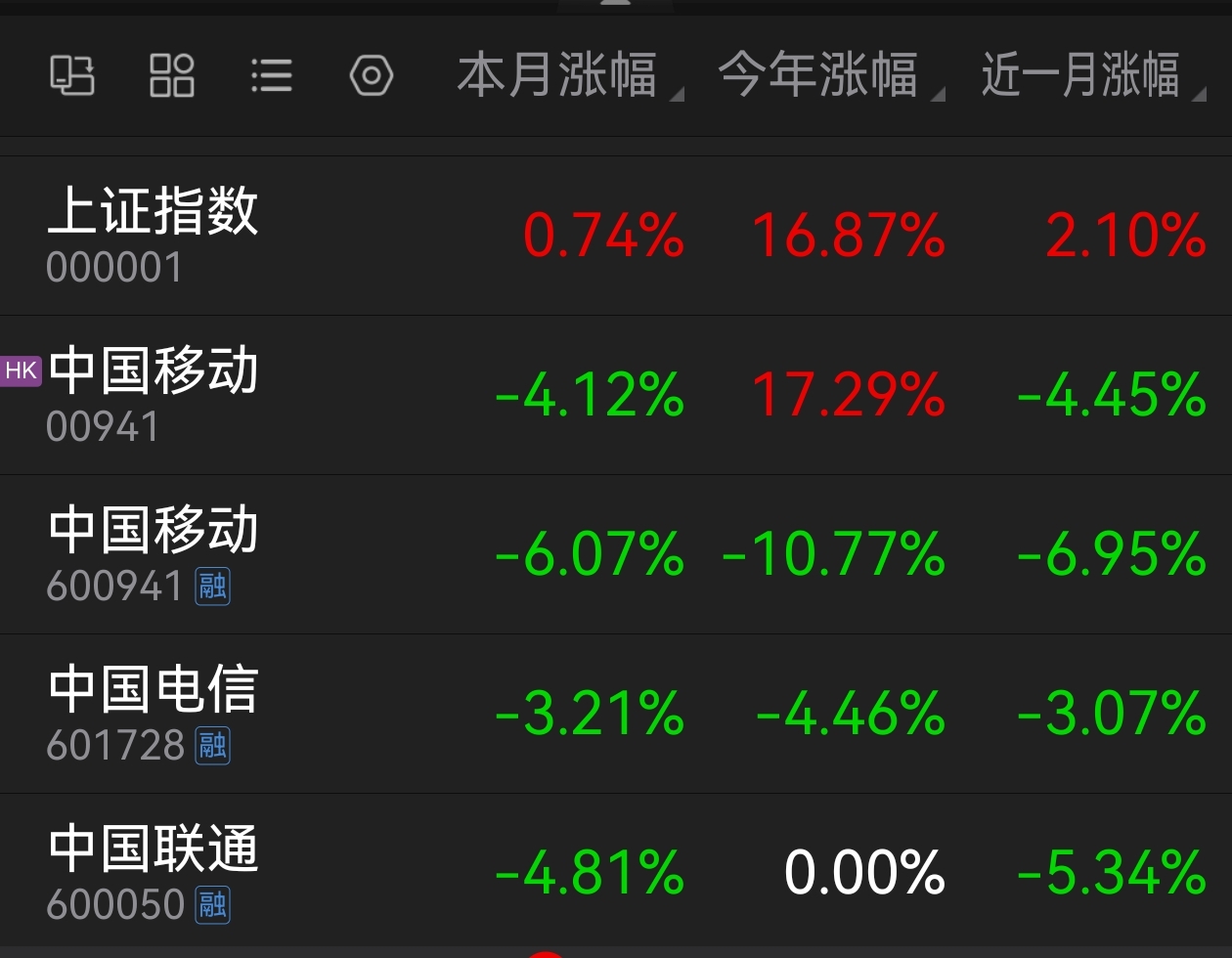 $中国电信(SH601728)$ 中国电信的伙伴们知足吧,今年中国移动的跌幅比电信大。谁的日子都不好过啊。