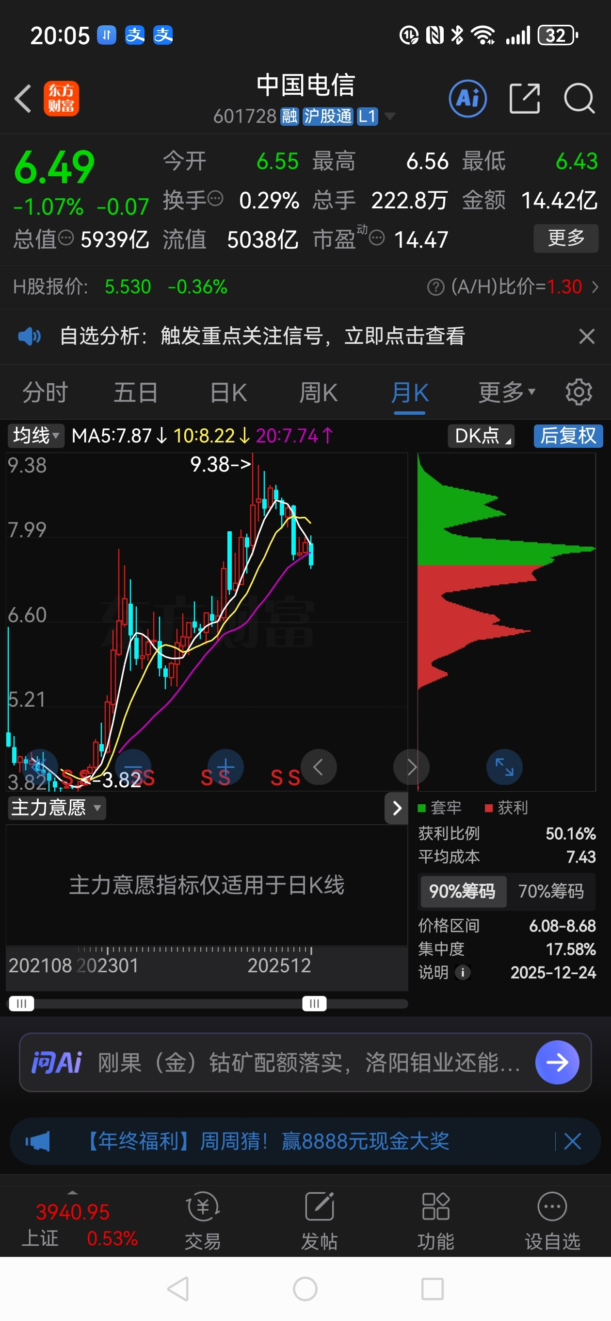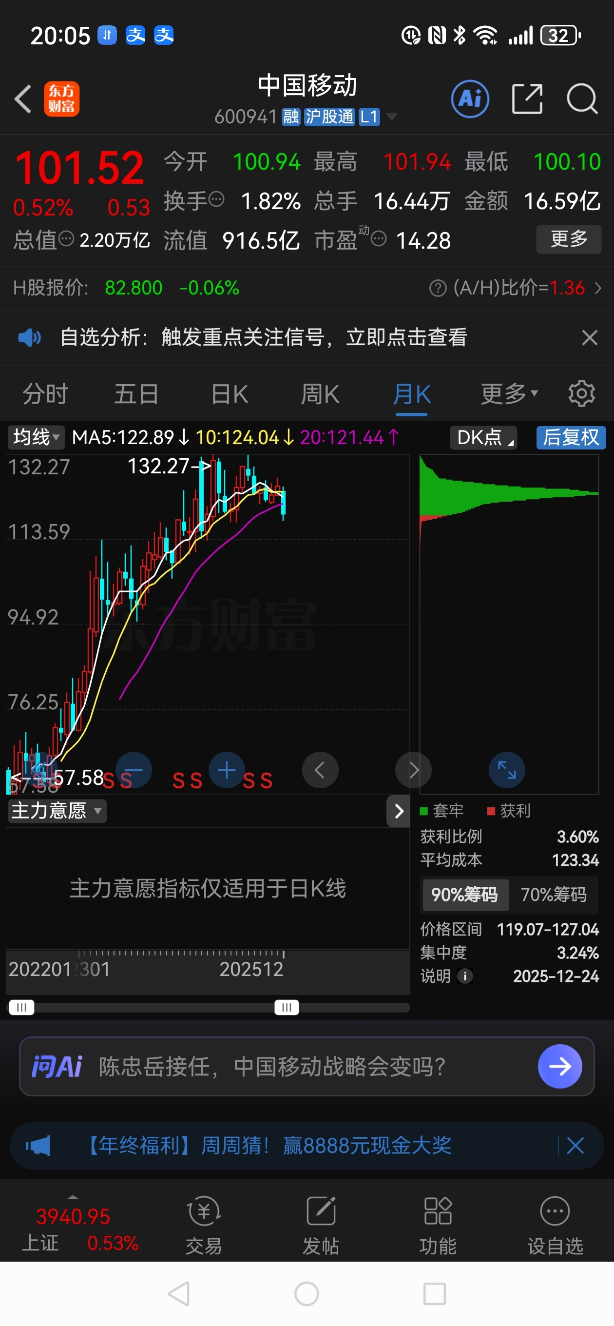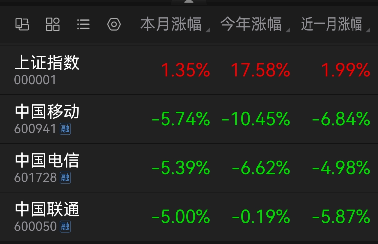 看中国移动和中国电信的月K线,这俩的走势依然很健康,要论年计量的长线持有股。目前