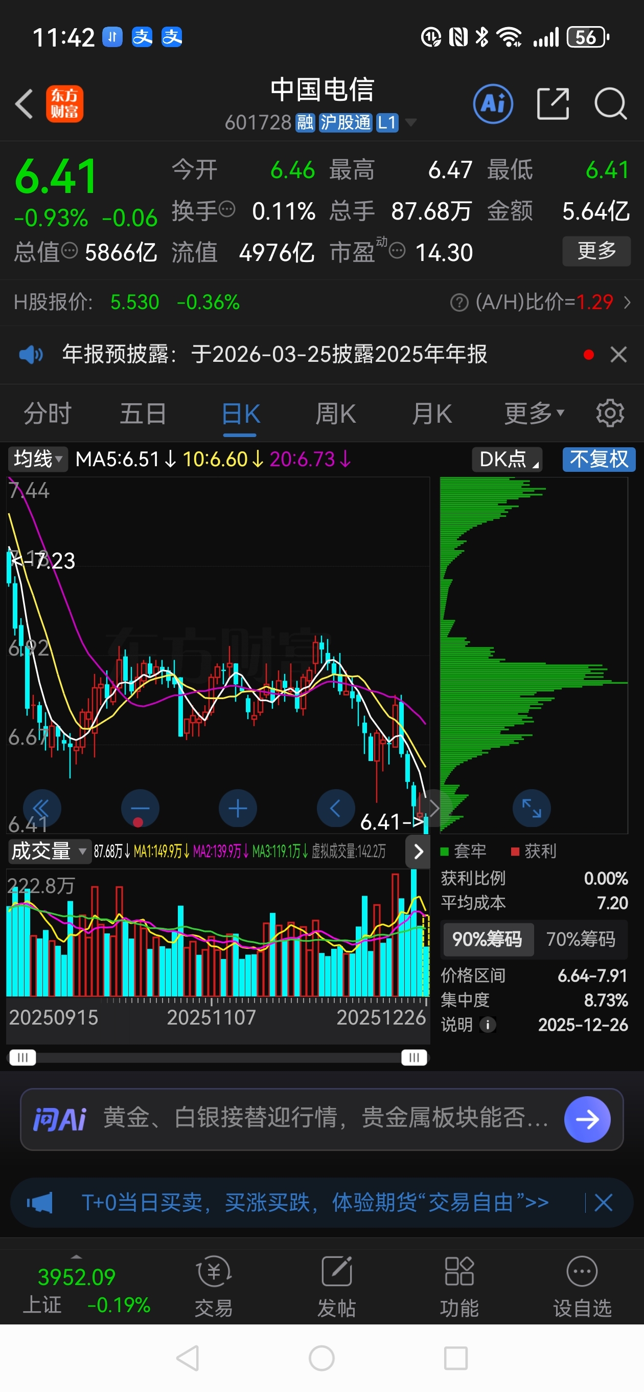 早盘中国电信以近期的最低价收盘,持股收益的人占比为0。隔壁的中国移动也是一地鸡毛